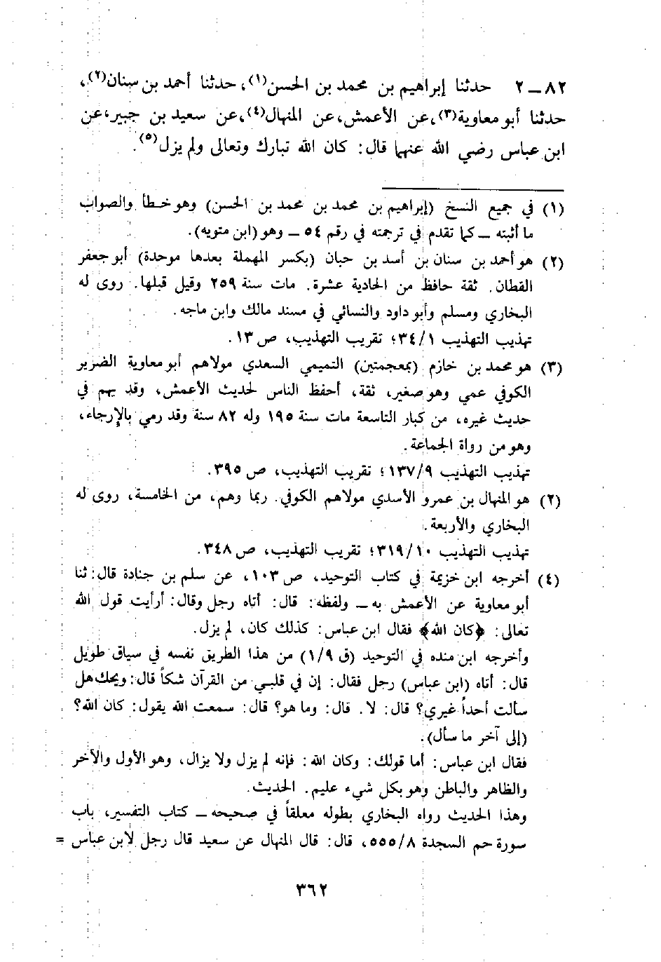 82 - حَدَّثَنَا إِبْرَاهِيمُ بْنُ مُحَمَّدِ بْنِ الْحَسَنِ، حَدَّثَنَا أَحْمَدُ بْنُ سِنَانٍ، حَدَّثَنَا أَبُو مُعَاوِيَةَ، عَنِ الْأَعْمَشِ، عَنِ الْمِنْهَالِ، عَنْ سَعِيدِ بْنِ جُبَيْرٍ، عَنِ ابْنِ عَبَّاسٍ رَضِيَ اللَّهُ عَنْهُمَا، قَالَ: «§كَانَ اللَّهُ تَبَارَكَ وَتَعَالَى، وَلَمْ يَزَلْ»