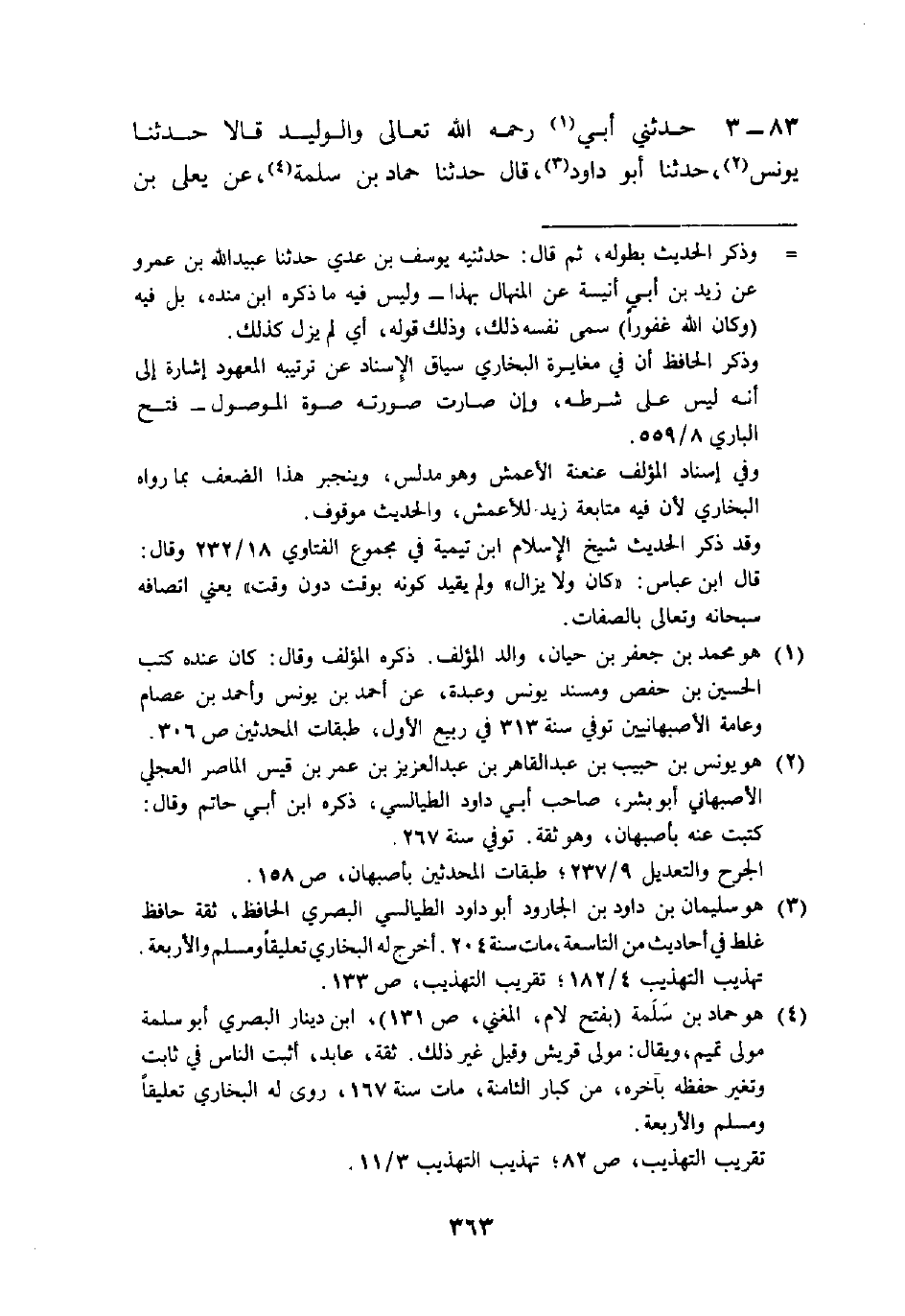83 - حَدَّثَنِي أَبِي رَحِمَهُ اللَّهُ تَعَالَى وَالْوَلِيدُ قَالَا: حَدَّثَنَا يُونُسُ، حَدَّثَنَا أَبُو دَاوُدَ، قَالَ: حَدَّثَنَا حَمَّادُ بْنُ سَلَمَةَ، عَنْ يَعْلَى بْنِ -[364]- عَطَاءٍ، عَنْ وَكِيعِ بْنِ حُدُسٍ، عَنْ أَبِي رَزِينٍ، قَالَ: قُلْتُ: يَا رَسُولَ اللَّهِ، أَيْنَ كَانَ رَبُّنَا تَبَارَكَ وَتَعَالَى قَبْلَ أَنْ يَخْلُقَ الْعَرْشَ؟ قَالَ: «§كَانَ فِي عَمَاءٍ مَا فَوْقَهُ هَوَاءٌ، وَلَا تَحْتَهُ هَوَاءٌ، ثُمَّ خَلَقَ الْعَرْشَ عَلَى الْمَاءِ»