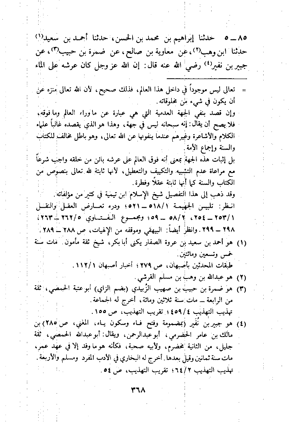 85 - حَدَّثَنَا إِبْرَاهِيمُ بْنُ مُحَمَّدِ بْنِ الْحَسَنِ، حَدَّثَنَا أَحْمَدُ بْنُ سَعِيدٍ، حَدَّثَنَا ابْنُ وَهْبٍ، عَنْ مُعَاوِيَةَ بْنِ صَالِحٍ، عَنْ ضَمْرَةَ بْنِ حَبِيبٍ، عَنْ جُبَيْرِ بْنِ نُفَيْرٍ رَضِيَ اللَّهُ عَنْهُ، قَالَ: «إِنَّ §اللَّهَ عَزَّ وَجَلَّ كَانَ عَرْشُهُ عَلَى الْمَاءِ -[369]-، وَإِنَّهُ خَلَقَ الْقَلَمَ، فَكَتَبَ مَا هُوَ خَالِقٌ إِلَى يَوْمِ الْقِيَامَةِ، وَمَا هُوَ كَائِنٌ إِلَى يَوْمِ الْقِيَامَةِ، ثُمَّ إِنَّ ذَلِكَ الْكِتَابَ سَبَّحَ اللَّهَ، وَمَجَّدَهُ أَلْفَ عَامٍ قَبْلَ أَنْ يَبْدَأَ خَلْقَ شَيْءٍ مِنَ الْخَلْقِ»