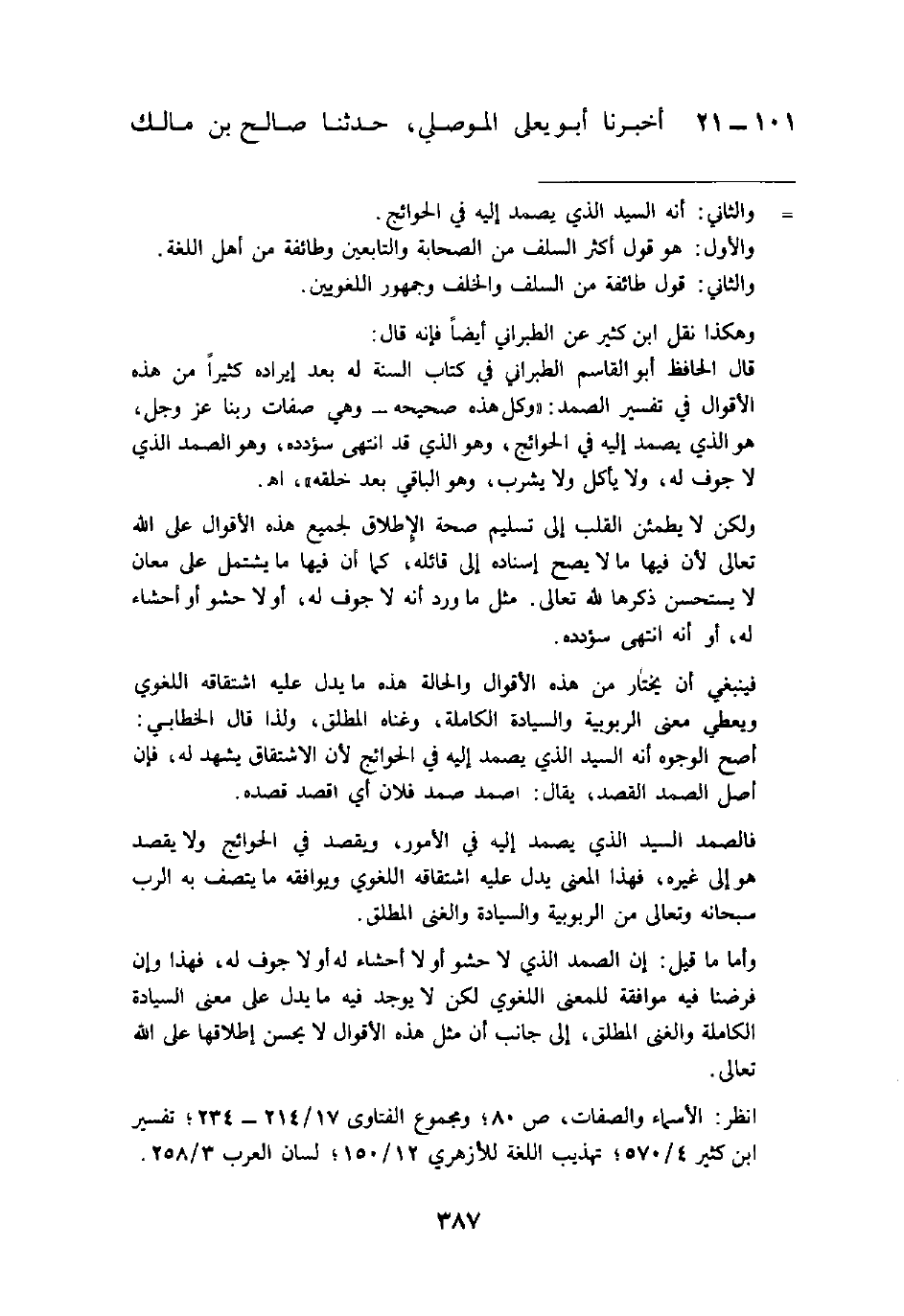 101 - أَخْبَرَنَا أَبُو يَعْلَى الْمَوْصِلِيُّ، حَدَّثَنَا صَالِحُ بْنُ مَالِكٍ -[388]- الْخُوَارَزْمِيُّ، قَالَ: قَرَأَ عَلَيْنَا عَبْدُ الْعَزِيزِ بْنُ عَبْدِ اللَّهِ بْنِ أَبِي سَلَمَةَ الْمَاجِشُونُ رَحِمَهُ اللَّهُ تَعَالَى: " §اعْلَمْ أَنَّ اللَّهَ تَعَالَى أَوَّلٌ، لَمْ يَزَلْ أَوَّلًا، وَلَيْسَ بِالْأَوَّلِ الَّذِي كَانَ أَوَّلَ مَا كَانَ مِنَ الْأَشْيَاءِ، وَقَدْ كَانَ هُوَ الْآخِرَ الَّذِي لَمْ يَزَلْ لَيْسَ بِالْآخِرِ الَّذِي يَكُونُ آخِرًا، ثُمَّ لَا يَكُونُ، وَهُوَ الْآخِرُ الَّذِي لَا يَفْنَى، وَالْأَوَّلُ الَّذِي لَا يَبِيدُ، الْقَدِيمُ الَّذِي لَا بِدَايَةَ -[389]- لَهُ لَمْ يَحْدُثْ كَمَا حَدَثَتِ الْأَشْيَاءُ لَمْ يَكُنْ صَغِيرًا فَكَبِرَ، وَلَا ضَعِيفًا فَقَوِيَ، وَلَا نَاقِصًا فَتَمَّ، وَلَا جَاهِلًا فَعَلِمَ، لَمْ يَزَلْ قَوِيًّا عَالِيًا كَبِيرًا مُتَعَالِيًا لَمْ تَأْتِ طَرْفَةُ عَيْنٍ قَطُّ إِلَّا وَهُوَ اللَّهُ، لَمْ يَزَلْ رَبًّا، وَلَا يَزَالُ أَبَدًا كَذَلِكَ فِيمَا كَانَ، وَكَذَلِكَ فِيمَا بَقِيَ يَكُونُ، وَكَذَلِكَ هُوَ الْآنَ لَمْ يَسْتَحْدِثْ عِلْمًا بَعْدَ أَنْ لَمْ يَكُنْ يَعْلَمُ، وَلَا قُوَّةً بَعْدَ قُوَّةٍ لَمْ تَكُنْ فِيهِ، وَلَمْ يَتَغَيَّرْ عَنْ حَالٍ إِلَى حَالٍ بِزِيَادَةٍ، وَلَا نُقْصَانٍ لِأَنَّهُ لَمْ يَبْقَ مِنَ الْمُلْكِ وَالْعَظَمَةِ شَيْءٌ إِلَّا وَهُوَ فِيهِ، وَلَنْ يَزِيدَ أَبَدًا عَنْ شَيْءٍ كَانَ عَلَيْهِ إِنَّمَا يَزِيدُ مَنْ سَيَنْقُصُ بَعْدَ زِيَادَةٍ كَمَا كَانَ قَبْلَ زِيَادَتِهِ نَاقِصًا، وَإِنَّمَا يَزْدَادُ قُوَّةً مَنْ سَيَضْعُفُ بَعْدَ قُوَّتِهِ كَمَا كَانَ قَبْلَ زِيَادَتِهِ نَاقِصًا، وَإِنَّمَا يَزْدَادُ عِلْمًا مَنْ سَيَجْهَلُ بَعْدَ عِلْمِهِ كَمَا كَانَ قَبْلَ عِلْمِهِ جَاهِلًا، فَأَمَّا الدَّائِمُ -[390]- الَّذِي لَا نَفَادَ لَهُ الْحَيُّ الَّذِي لَا يَمُوتُ خَالِقُ مَا يُرَى، وَمَا لَا يُرَى عَالِمُ كُلِّ شَيْءٍ بِغَيْرِ تَعْلِيمٍ فَإِنَّ ذَلِكَ هُوَ الْوَاحِدُ فِي كُلِّ شَيْءٍ الْمُتَوَحِّدُ بِكُلِّ شَيْءٍ لَيْسَ كَمِثْلِهِ شَيْءٌ، وَكُلُّ شَيْءٍ هَالِكٌ إِلَّا وَجْهَهَ، وَرَاجِعٌ إِلَى مَا كَانَ عَلَيْهِ بَدْءُ أَمْرِهِ، وَلَمْ يَكُنْ تَبَارَكَ وَتَعَالَى مِنْ شَيْءٍ، فَيَرْجِعَ إِلَيْهِ، وَلَمْ يَكُنْ قَبْلَهُ شَيْءٌ فَيَقْضِيَ عَلَيْهِ لَا يَنْبَغِي أَنْ يَكُونَ مِنْ صِفَتِهِ أَنَّهُ لَمْ يَكُنْ مَرَّةً، ثُمَّ كَانَ إِنَّمَا تِلْكَ صِفَةُ الْمَخْلُوقِينَ، وَلَيْسَت بِصِفَةِ الْخَالِقِ لِأَنَّهُ خَلَقَ، وَلَمْ يَكُنْ يُخْلَقُ، وَبَدَأَ وَلَمْ يُبْدَأْ فَكَمَا لَمْ يُبْدَأْ، فَكَذَلِكَ لَا يَفْنَى، وَكَمَا لَا يَفْنَى، وَلَا يَبْلَى فَكَذَلِكَ، وَعِزَّةُ وَجْهِهِ لَمْ يَزَلْ رَبًّا، وَإِنَّمَا يَبْلَى وَيَمُوتُ مَنْ كَانَ قَبْلَ حَيَاتِهِ مَيِّتًا، قَالَ اللَّهُ عَزَّ وَجَلَّ: {وَكُنْتُمْ أَمْوَاتًا فَأَحْيَاكُمْ، ثُمَّ يُمِيتُكُمْ، ثُمَّ يُحْيِيكُمْ، ثُمَّ إِلَيْهِ تُرْجَعُونَ} [البقرة: 28] وَقَالَ عَزَّ وَجَلَّ: {رَبَّنَا أَمَتَّنَا اثْنَتَيْنِ وَأَحْيَيْتَنَا اثْنَتَيْنِ} [غافر: 11] فَكِلْتَاهُمَا مَوْتَتَانِ رَبُّنَا لَمْ يَكُنْ مَيِّتًا، فَحَيِيَ وَكَذَلِكَ هُوَ الْحَيُّ الَّذِي لَا يَمُوتُ هُوَ رَبُّ الْخَلْقِ قَبْلَ أَنْ يَخْلُقَهُمْ كَمَا هُوَ رَبُّهُمْ بَعْدَ أَنْ خَلَقَهُمْ، وَقَدْ أَحَاطَ بِهِمْ قَبْلَ خَلْقِهِمْ عِلْمًا، وَأَحْصَاهُمْ عَدَدًا، وَأَثْبَتَهُمْ كِتَابًا، فَكَانَ مِنْ أَمْرِهِ فِي تَقْدِيرِهِ إِيَّاهُمْ قَبْلَ أَنْ يَكُونُوا عَلَى مَا هُمْ عَلَيْهِ مِنْ أَمْرِهِمْ بَعْدَمَا كَانُوا لَيْسَ خَلْقُهُ إِيَّاهُمْ بِأَعْظَمَ فِي مُلْكِهِ مِنْ تَقْدِيرِهِ ذَلِكَ مِنْهُمْ قَبْ