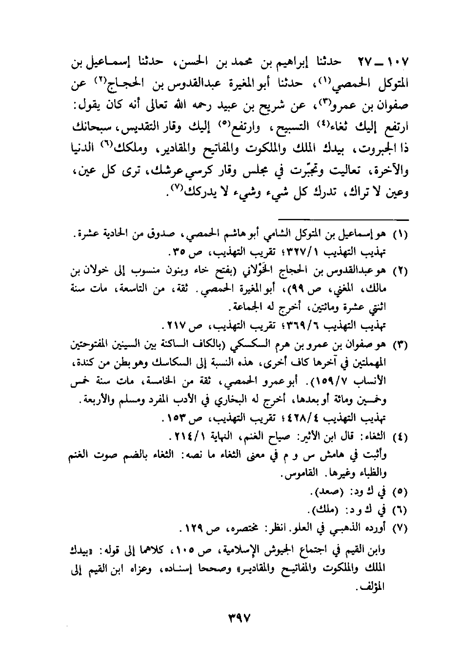 107 - حَدَّثَنَا إِبْرَاهِيمُ بْنُ مُحَمَّدِ بْنِ الْحَسَنِ، حَدَّثَنَا إِسْمَاعِيلُ بْنُ الْمُتَوَكِّلِ الْحِمْصِيُّ، حَدَّثَنَا أَبُو الْمُغِيرَةِ عَبْدُ الْقُدُّوسِ بْنُ الْحَجَّاجِ، عَنْ صَفْوَانَ بْنِ عَمْرٍو، عَنْ شُرَيْحِ بْنِ عُبَيْدٍ رَحِمَهُ اللَّهُ تَعَالَى، أَنَّهُ كَانَ يَقُولُ: «§ارْتَفَعَ إِلَيْكَ ثُغَاءُ التَّسْبِيحِ، وَارْتَفَعَ إِلَيْكَ وَقَارُ التَّقْدِيسِ سُبْحَانَكَ ذَا الْجَبَرُوتِ بِيَدِكَ الْمُلْكُ وَالْمَلَكُوتُ، وَالْمَفَاتِيحُ، وَالْمَقَادِيرُ، وَمُلْكُكُ الدُّنْيَا وَالْآخِرَةُ تَعَالَيْتَ، وَتَجَبَّرْتَ فِي مَجْلِسِ وَقَارِ كُرْسِيِّ عَرْشِكَ، تَرَى كُلَّ عَيْنٍ وَعَيْنٌ لَا تَرَاكَ، تُدْرِكُ كُلَّ شَيْءٍ وَشَيْءٌ لَا يُدْرِكُكَ»
