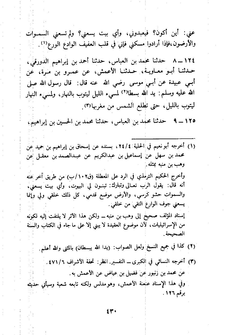 حَدَّثَنَا مُحَمَّدُ بْنُ الْعَبَّاسِ، حَدَّثَنَا مُحَمَّدُ بْنُ الْحُسَيْنِ بْنِ إِبْرَاهِيمَ، وَأَحْمَدُ بْنُ مَنْصُورٍ، قَالَا: حَدَّثَنَا مُعَاوِيَةُ بْنُ هِشَامٍ، حَدَّثَنَا سُفْيَانُ الثَّوْرِيُّ، عَنِ الْأَعْمَشِ، عَنْ عَمْرِو بْنِ مُرَّةَ، عَنْ أَبِي عُبَيْدَةَ، عَنْ أَبِي مُوسَى رَضِيَ اللَّهُ عَنْهُ، قَالَ: قَالَ رَسُولُ اللَّهِ صَلَّى اللهُ عَلَيْهِ وَسَلَّمَ: «إِنَّ §اللَّهَ عَزَّ وَجَلَّ لَا يَنَامُ، وَلَا يَنْبَغِي لَهُ أَنْ يَنَامَ، يَخْفِضُ الْقِسْطَ وَيَرْفَعُهُ، يُرْفَعُ إِلَيْهِ عَمَلُ اللَّيْلِ قَبْلَ النَّهَارِ، وَعَمَلُ النَّهَارِ قَبْلَ اللَّيْلِ، حِجَابُهُ النَّارُ، لَوْ كَشَفَهَا لَأَحْرَقَتْ سُبُحَاتُ وَجْهِهِ كُلَّ شَيْءٍ أَدْرَكَهُ بَصَرُهُ»