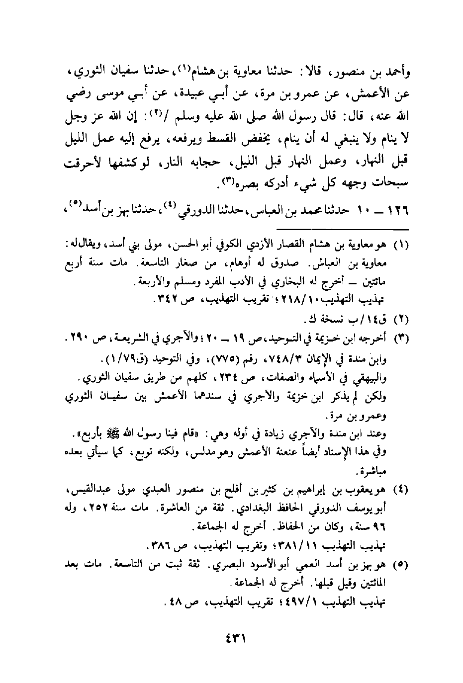 حَدَّثَنَا مُحَمَّدُ بْنُ الْعَبَّاسِ، حَدَّثَنَا الدَّوْرَقِيُّ، حَدَّثَنَا بَهْزُ بْنُ أَسَدٍ، حَدَّثَنَا شُعْبَةُ، عَنْ عَمْرِو بْنِ مُرَّةَ، قَالَ: سَمِعْتُ أَبَا عُبَيْدَةَ، يُحَدِّثُ عَنْ أَبِي مُوسَى رَضِيَ اللَّهُ عَنْهُ، أَنَّ رَسُولَ اللَّهِ صَلَّى اللهُ عَلَيْهِ وَسَلَّمَ، قَالَ: «إِنَّ اللَّهَ تَبَارَكَ وَتَعَالَى §يَبْسُطُ يَدَهُ بِالنَّهَارِ لِيَتُوبَ مُسِيءُ اللَّيْلِ، وَيَبْسُطُ يَدَهُ بِاللَّيْلِ لِيَتُوبَ مُسِيءُ النَّهَارِ، حَتَّى تَطْلُعَ الشَّمْسُ مِنْ مَغْرِبِهَا»