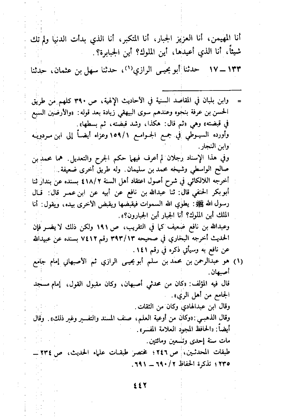 حَدَّثَنَا أَبُو يَحْيَى الرَّازِيُّ، حَدَّثَنَا سَهْلُ بْنُ عُثْمَانَ، حَدَّثَنَا يَحْيَى بْنُ يَمَانٍ، عَنْ عَمَّارِ بْنِ عُمَرَ، عَنِ الْحَسَنِ رَحِمَهُ اللَّهُ تَعَالَى، فِي قَوْلِهِ عَزَّ وَجَلَّ: {§وَالْأَرْضُ جَمِيعًا قَبْضَتُهُ يَوْمَ الْقِيَامَةِ} [الزمر: 67] قَالَ: «بِقَضِّهَا وَقَضِيضِهَا، كَأَنَّهَا جَوْزَةٌ فِي يَدِهِ»