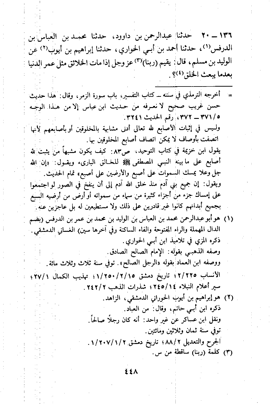 حَدَّثَنَا عَبْدُ الرَّحْمَنِ بْنُ دَاوُدَ، حَدَّثَنَا مُحَمَّدُ بْنُ الْعَبَّاسِ بْنِ الدُّرَفْسِ، حَدَّثَنَا أَحْمَدُ بْنُ أَبِي الْحَوَارِيِّ، حَدَّثَنَا إِبْرَاهِيمُ بْنُ أَيُّوبَ، عَنِ الْوَلِيدِ بْنِ مُسْلِمٍ، قَالَ: §يُقِيمُ رَبُّنَا عَزَّ وَجَلَّ إِذَا مَاتَ الْخَلَائِقُ مِثْلَ عُمْرِ الدُّنْيَا بَعْدَ مَا يَبْعَثُ الْخَلْقَ -[449]- قَالَ أَحْمَدُ: قُلْتُ لِعُمَرَ بْنِ عَطَاءٍ: فَأَكْرَبَنِي هَذَا الْحَدِيثُ ثَمَانِيَةً وَعِشْرِينَ أَلْفًا، قَالَ: فَانْظُرْ كَمْ كَانَ قَبْلَ أَنْ يُخْلَقَ الْخَلْقُ، وَكَمْ يَكُونُ بَعْدَمَا يُبْعَثُ الْخَلْقُ؟