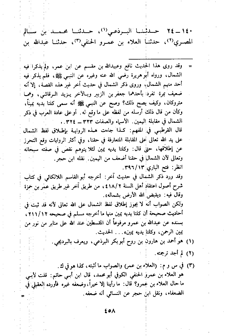حَدَّثَنَا الْبَرْذَعِيُّ، حَدَّثَنَا مُحَمَّدُ بْنُ سَالِمٍ الْمِصْرِيُّ، حَدَّثَنَا الْعَلَاءُ بْنُ عَمْرٍو الْحَنَفِيُّ، حَدَّثَنَا عَبْدُ اللَّهِ بْنُ -[459]- إِدْرِيسَ، عَنْ أَبِيهِ، عَنْ نَافِعٍ، عَنِ ابْنِ عُمَرَ رَضِيَ اللَّهُ عَنْهُمَا، قَالَ: قَالَ رَسُولُ اللَّهِ صَلَّى اللهُ عَلَيْهِ وَسَلَّمَ: " يَقْبِضُ اللَّهُ عَزَّ وَجَلَّ الْأَرَضِينَ يَوْمَ الْقِيَامَةِ، وَالسَّمَوَاتُ مَطْوِيَّاتٌ بِيَمِينِهِ ثُمَّ يَقُولُ: §أَنَا الْمَلِكُ، أَنَا الْمَلِكُ "