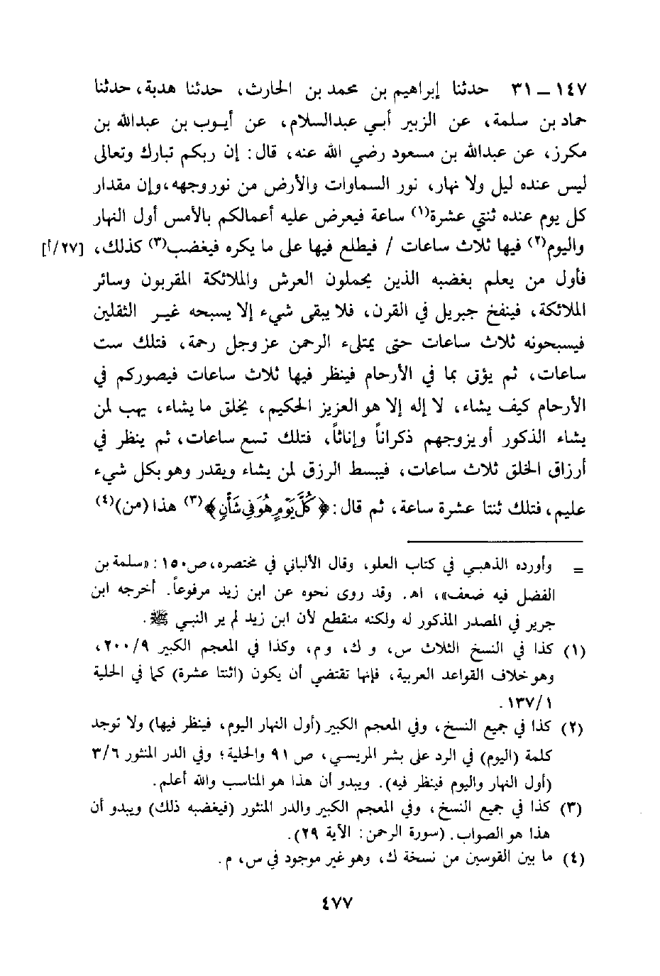 حَدَّثَنَا إِبْرَاهِيمُ بْنُ مُحَمَّدِ بْنِ الْحَارِثِ، حَدَّثَنَا هُدْبَةُ، حَدَّثَنَا حَمَّادُ بْنُ سَلَمَةَ، عَنِ الزُّبَيْرِ أَبِي عَبْدِ السَّلَامِ، عَنْ أَيُّوبَ بْنِ عَبْدِ اللَّهِ بْنِ مُكْرَزٍ، عَنْ عَبْدِ اللَّهِ بْنِ مَسْعُودٍ رَضِيَ اللَّهُ عَنْهُ، قَالَ: " إِنَّ رَبَّكُمْ تَبَارَكَ وَتَعَالَى §لَيْسَ عِنْدَهُ لَيْلٌ وَلَا نَهَارٌ، نُورُ السَّمَاوَاتِ وَالْأَرْضِ مِنْ نُورِ وَجْهِهِ، وَإِنَّ مِقْدَارَ كُلِّ يَوْمٍ عِنْدَهُ ثِنْتَي عَشْرَةَ سَاعَةً، فَيُعْرَضُ عَلَيْهِ أَعْمَالُكُمْ بِالْأَمْسِ أَوَّلَ النَّهَارِ وَالْيَوْمِ، فِيهَا ثَلَاثُ سَاعَاتٍ، فَيَطَّلِعُ فِيهَا عَلَى مَا يَكْرَهُ فَيَغْضَبُ كَذَلِكَ، فَأَوَّلُ مَنْ يَعْلَمُ بِغَضَبِهِ الَّذِينَ يَحْمِلُونَ الْعَرْشَ، وَالْمَلَائِكَةُ الْمُقَرَّبُونَ، وَسَائِرُ الْمَلَائِكَةِ، فَيَنْفُخُ جِبْرِيلُ فِي الْقَرْنِ فَلَا يَبْقَى شَيْءٌ إِلَّا يُسَبِّحُهُ غَيْرُ الثَّقَلَيْنِ، فَيُسَبِّحُونَهُ ثَلَاثَ سَاعَاتٍ حَتَّى يَمْتَلِئَ الرَّحْمَنُ عَزَّ وَجَلَّ رَحْمَةً، فَتِلْكَ سِتُّ سَاعَاتٍ، ثُمَّ يُؤْتَى بِمَا فِي الْأَرْحَامِ فَيَنْظُرُ فِيهَا ثَلَاثَ سَاعَاتٍ، فَيُصَوِّرُكُمْ فِي الْأَرْحَامِ كَيْفَ يَشَاءُ، لَا إِلَهَ إِلَّا هُوَ الْعَزِيزُ الْحَكِيمُ يَخْلُقُ مَا يَشَاءُ، يَهَبُ لِمَنْ يَشَاءُ الذُّكُورَ، أَوْ يُزَوِّجُهُمْ ذُكْرَانًا وَإِنَاثًا، فَتِلْكَ تِسْعُ سَاعَاتٍ، ثُمَّ يَنْظُرُ فِي أَرْزَاقِ الْخَلْقِ ثَلَاثَ سَاعَاتٍ، فَيَبْسُطُ الرِّزْقَ لِمَنْ يَشَاءُ وَيَقْدِرُ وَهُوَ بِكُلِّ شَيْءٍ عَلِيمٌ، فَتِلْكَ ثِنْتَا عَشْرَةَ سَاعَةً، ثُمَّ قَالَ: {كُلَّ يَوْمٍ هُوَ فِي شَأْنٍ} [الرحمن: 29] هَذَا مِنْ -[478]- شَأْنِكُمْ وَشَأْنِ رَبِّكُمْ عَزَّ وَجَلَّ "