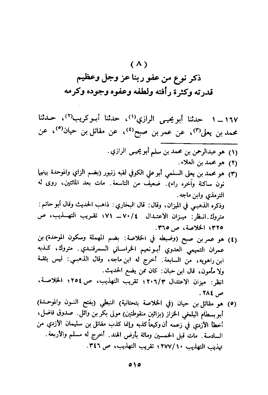 167 - حَدَّثَنَا أَبُو يَحْيَى الرَّازِيُّ، حَدَّثَنَا أَبُو كُرَيْبٍ، حَدَّثَنَا مُحَمَّدُ بْنُ يَعْلَى، عَنْ عُمَرَ بْنِ صُبْحٍ، عَنْ مُقَاتِلِ بْنِ حَيَّانَ، عَنْ عِكْرِمَةَ، عَنِ ابْنِ عَبَّاسٍ رَضِيَ اللَّهُ عَنْهُمَا، فِي قَوْلِهِ عَزَّ وَجَلَّ: {§ادْعُونِي أَسْتَجِبْ لَكُمْ} [غافر: 60] قَالَ: «وَحِّدُونِي بِالرُّبُوبِيَّةِ أَغْفِرْ لَكُمْ»