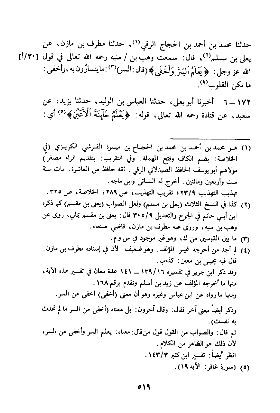 أَخْبَرَنَا أَبُو يَعْلَى، حَدَّثَنَا الْعَبَّاسُ بْنُ الْوَلِيدِ، حَدَّثَنَا يَزِيدُ، عَنْ سَعِيدٍ، عَنْ قَتَادَةَ رَحِمَهُ اللَّهُ تَعَالَى، قَوْلَهُ: {§يَعْلَمُ خَائِنَةَ الْأَعْيُنِ} [غافر: 19] أَيْ: «يَعْلَمُ هَمْزَهُ بِعَيْنِهِ، وَإِغْمَاضَهُ فِيمَا لَا يُحِبُّ اللَّهُ وَلَا يَرْضَاهُ»