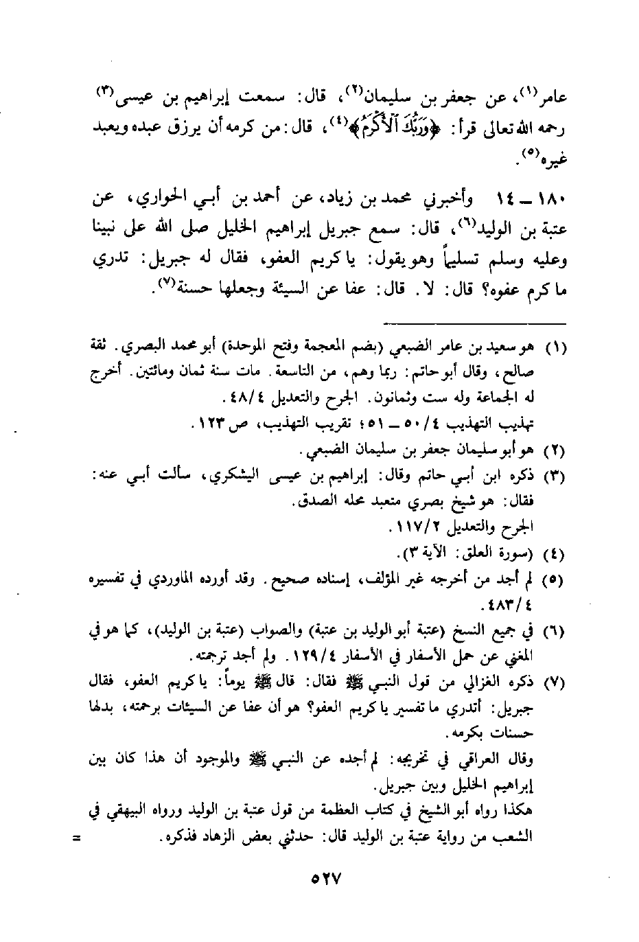 وَأَخْبَرَنِي مُحَمَّدُ بْنُ زِيَادٍ، عَنْ أَحْمَدَ بْنِ أَبِي الْحَوَارِيِّ، عَنْ عُتْبَةَ بْنِ الْوَلِيدِ، قَالَ: " سَمِعَ جِبْرِيلُ، إِبْرَاهِيمَ الْخَلِيلَ صَلَّى اللَّهُ عَلَى نَبِيِّنَا وَعَلَيْهِ وَسَلَّمَ تَسْلِيمًا وَهُوَ يَقُولُ: يَا كَرِيمَ الْعَفْوِ، فَقَالَ لَهُ جِبْرِيلُ: تَدْرِي مَا كَرَمُ عَفْوِهِ؟، قَالَ: لَا، قَالَ: §عَفَا عَنِ السَّيِّئَةِ، وَجَعَلَهَا حَسَنَةً "