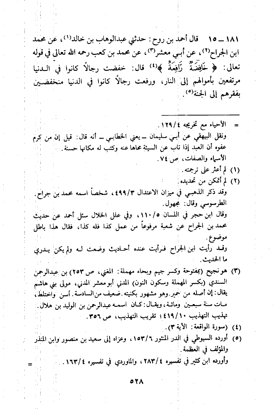 قَالَ أَحْمَدُ بْنُ رَوْحٍ: حَدَّثَنِي عَبْدُ الْوَهَّابِ بْنُ خَالِدٍ، عَنْ مُحَمَّدِ بْنِ الْجَرَّاحِ، عَنْ أَبِي مَعْشَرٍ، عَنْ مُحَمَّدِ بْنِ كَعْبٍ رَحِمَهُ اللَّهُ تَعَالَى، فِي قَوْلِهِ تَعَالَى: {§خَافِضَةٌ رَافِعَةٌ} [الواقعة: 3] ، قَالَ: «خَفَضَتْ رِجَالًا كَانُوا فِي الدُّنْيَا مُرْتَفِعِينَ بِأَمْوَالِهِمْ إِلَى النَّارِ، وَرَفَعَتْ رِجَالًا كَانُوا فِي الدُّنْيَا مُنْخَفِضِينَ بِفَقْرِهِمْ إِلَى الْجَنَّةِ»