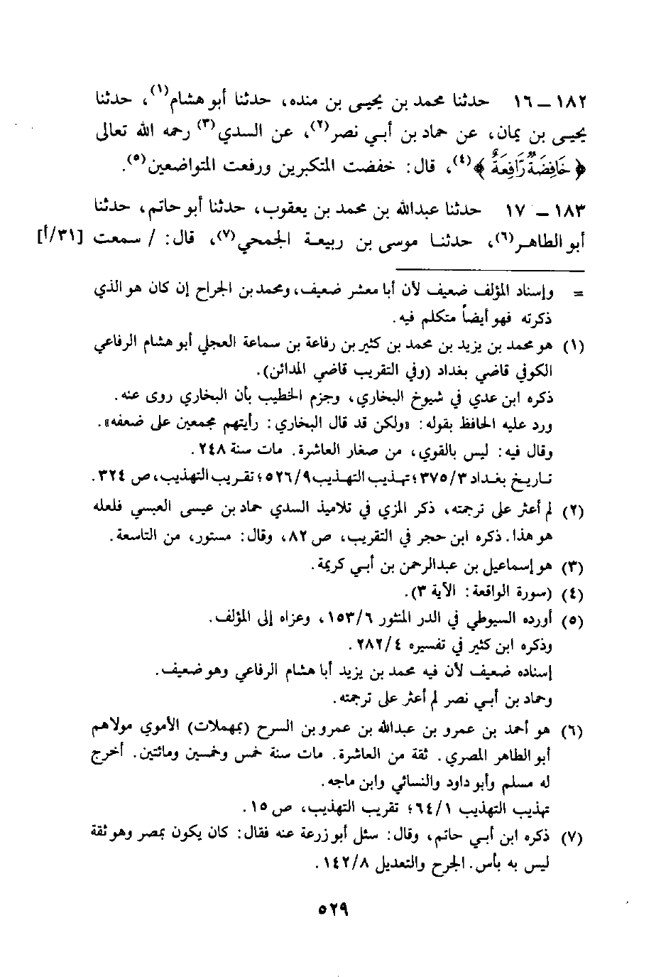 حَدَّثَنَا مُحَمَّدُ بْنُ يَحْيَى بْنِ مَنْدَهٍ، حَدَّثَنَا أَبُو هِشَامٍ، حَدَّثَنَا يَحْيَى بْنُ يَمَانٍ، عَنْ حَمَّادِ بْنِ أَبِي نَصْرٍ، عَنِ السُّدِّيِّ رَحِمَهُ اللَّهُ تَعَالَى، {§خَافِضَةٌ رَافِعَةٌ} [الواقعة: 3] ، قَالَ: «خَفَضَتِ الْمُتَكَبِّرِينَ، وَرَفَعَتِ الْمُتَوَاضِعِينَ»