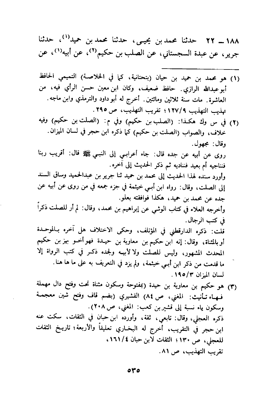 حَدَّثَنَا مُحَمَّدُ بْنُ يَحْيَى، حَدَّثَنَا مُحَمَّدُ بْنُ حُمَيْدٍ، حَدَّثَنَا جَرِيرٌ، عَنْ عَبْدَةَ السِّجِسْتَانِيِّ، عَنِ الصَّلْتِ بْنِ حَكِيمٍ، عَنْ أَبِيهِ، عَنْ جَدِّهِ، أَنَّ أَعْرَابِيًّا، قَالَ - أَرَاهُ لِلنَّبِيِّ صَلَّى اللهُ عَلَيْهِ وَسَلَّمَ -: أَقَرِيبٌ رَبُّنَا فَنُنَاجِيهِ، أَمْ بَعِيدٌ فَنُنَادِيهِ؟ فَأَنْزَلَ اللَّهُ عَزَّ وَجَلَّ {§وَإِذَا سَأَلَكَ عِبَادِي عَنِّي فَإِنِّي قَرِيبٌ} [البقرة: 186]