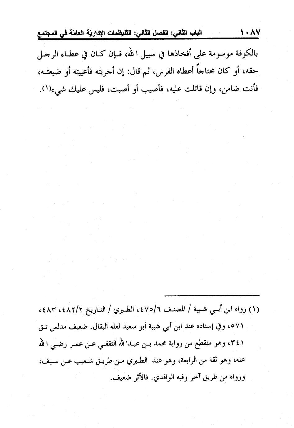 1 رواه ابن أبي شيبة / المصنف 6/475، الطبري / التاريخ 2/482، 483، 571، وفي إسناده عند ابن أبي شيبة أبو سعيد لعله البقال. ضعيف مدلس تق 341، وهو منقطع من رواية محمد بن عبد الله الثقفي عن عمر رضي الله عنه، وهو ثقة من الرابعة، وهو عند الطبري من طريق شعيب عن سيف، ورواه من طريق آخر وفيه الواقدي. فالأثر ضعيف.