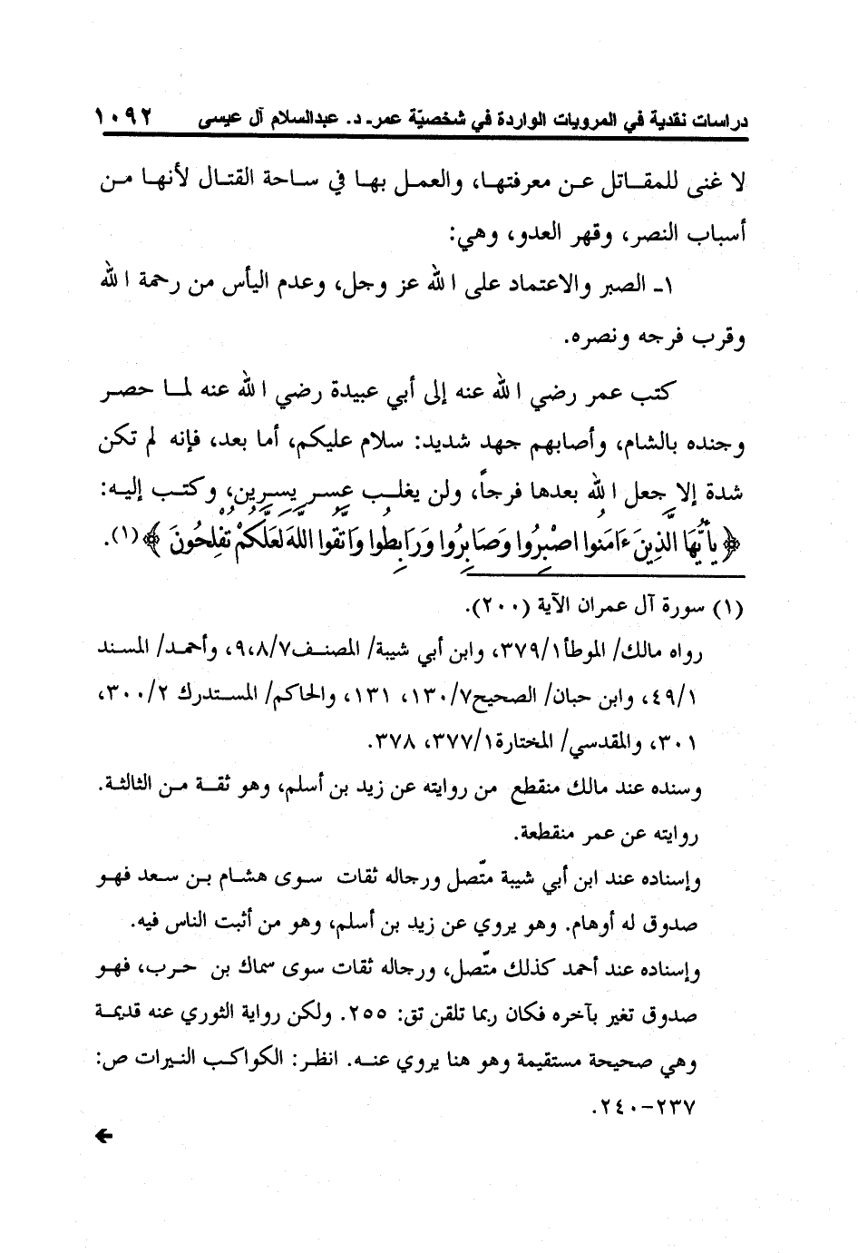 كتب عمر رضي الله عنه إلى أبي عبيدة رضي الله عنه لما حصر وجنده بالشام، وأصابهم جهد شديد: سلام عليكم، أما بعد، فإنه لم تكن شدة إلا جعل الله بعدها فرجاً، ولن يغلب عسر يسرين، وكتب إليه: {يأ يُّهَا الَّذِينَءَامَنُوا اصْبِرُوا وَصَابِرُوا وَرَابِطُوا وَاتَّقُوا اللَّهَ لَعَلَّكُمْ تُفْلِحُونَ} 1.