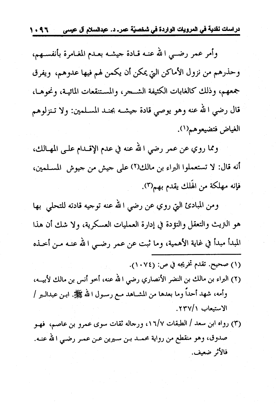 3 رواه ابن سعد / الطبقات 7/16، ورجاله ثقات سوى عمرو بن عاصم، فهو صدوق، وهو منقطع من رواية محمد بن سيرين عن عمر رضي الله عنه. فالأثر ضعيف.
