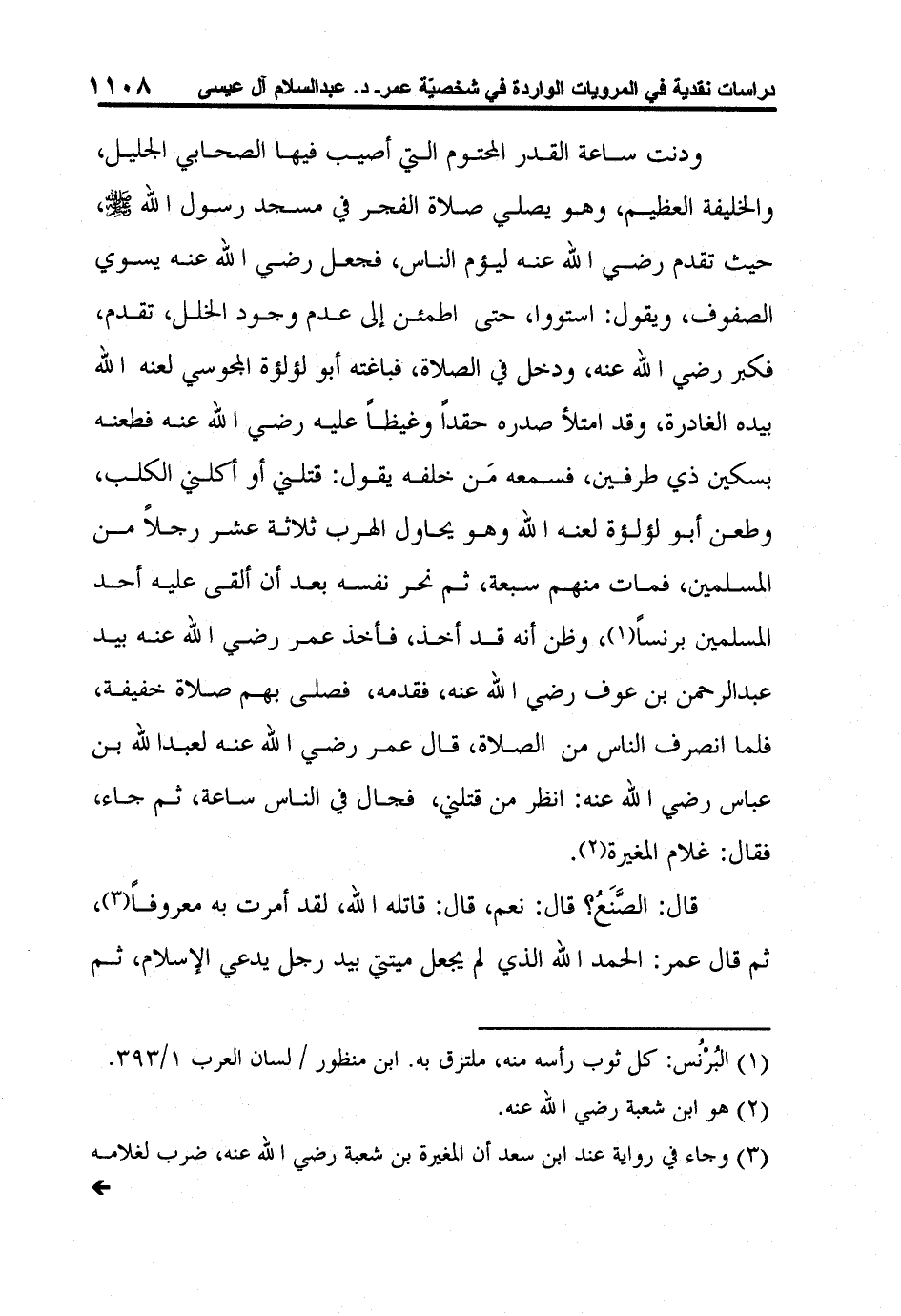 3 وجاء في رواية عند ابن سعد أن المغيرة بن شعبة رضي الله عنه، ضرب لغلامه أبي لؤلؤة لعنه الله عشرين ومائة درهم كل شهر، أربعة دراهم كل يوم، وكان خبيثاً إذا نظر إلى السبي الصغار، يأتي فيمسح رؤوسهم ويبكي ويقول: إن العرب أكلت كبدي، فلما قدم عمر من مكة جاء أبو لؤلؤة إلى عمر يريده، فوجده غادياً إلى السوق، وهو متكئ على يد عبد الله بن الزبير، فقال: يا أمير المؤمنين، إن سيدي المغيرة يكلفني ما لا أطيق من الضريبة. قال عمر: وكم كلفك؟ قال: أربعة دراهم كل يوم، قال: وما تعمل؟ قال: الأرحاء، وسكت عن سائر أعماله، فقال: في كم تعمل الرحى؟ فأخبره، قال: وبكم تبيعها؟ فأخبره، فقال: لقد كلفك يسيراً، انطلق فاعط مولاك ما سألك، فلما ولى قال عمر: ألا تجعل لنا رحى؟ قال: بلى، أجعل لك رحى يتحدث بها أهل الأمصار، ففزع عمر من كلمته. الطبقات الكبرى 3/347، من طريق الواقدي، ورواه من طريق آخر بإسناد حسن لكنه منقطع من رواية الزهري عن عمر بلفظ مقارب وفيه طول 3/345.