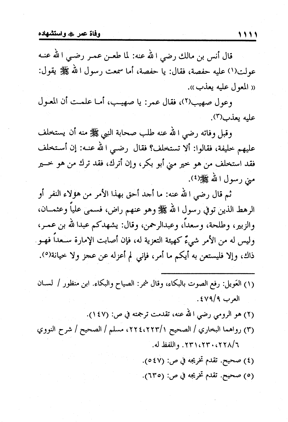 قال أنس بن مالك رضي الله عنه: لما طعن عمر رضي الله عنه عولت1 عليه حفصة، فقال: يا حفصة، أما سمعت رسول الله صلى الله عليه وسلم يقول: "المعول عليه يعذب".