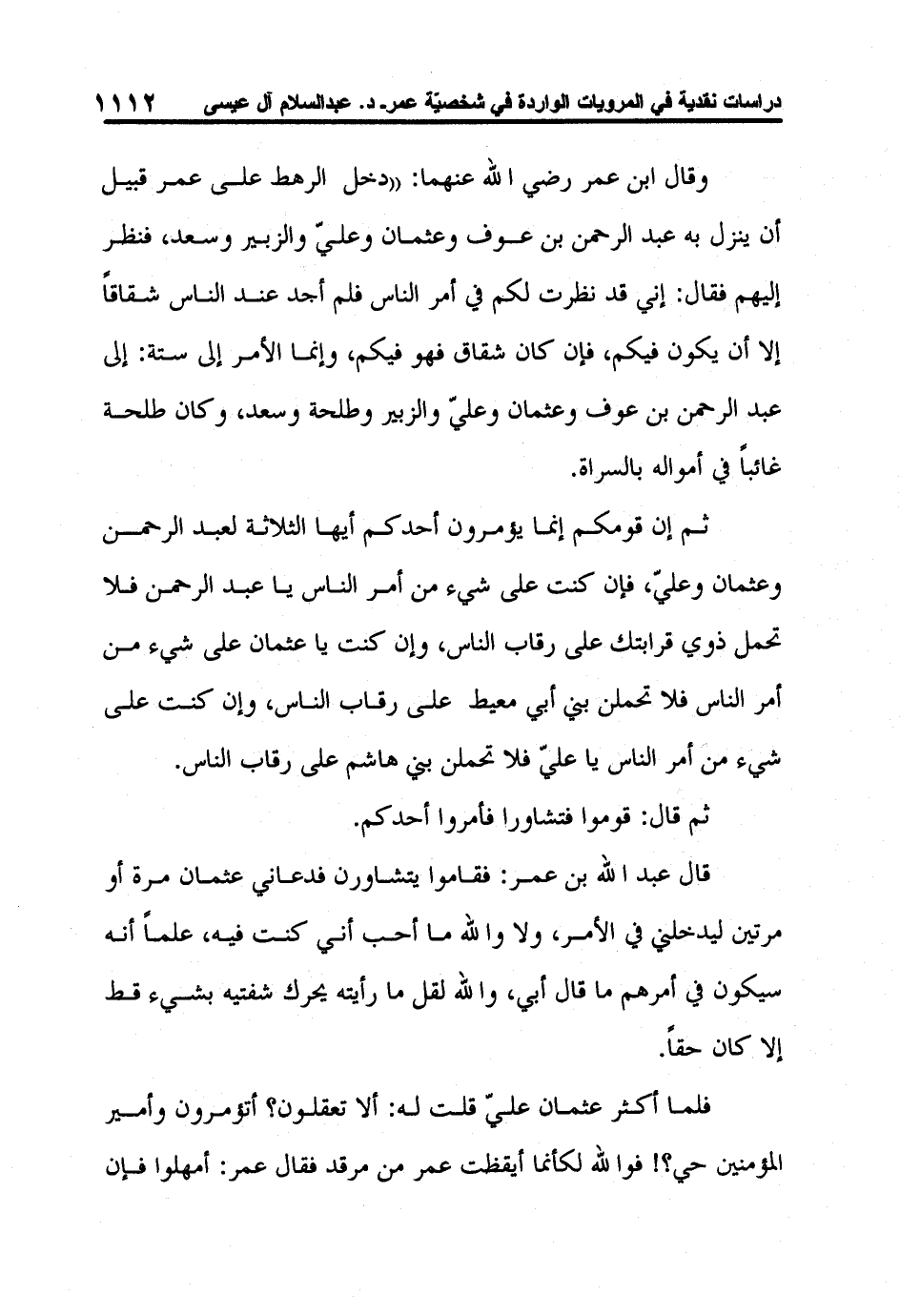 وقال ابن عمر رضي الله عنهما: "دخل الرهط على عمر قبيل أن ينزل به عبد الرحمن بن عوف وعثمان وعليّ والزبير وسعد، فنظر إليهم فقال: إني قد نظرت لكم في أمر الناس فلم أجد عند الناس شقاقاً إلا أن يكون فيكم، فإن كان شقاق فهو فيكم، وإنما الأمر إلى ستة: إلى عبد الرحمن بن عوف وعثمان وعليّ والزبير وطلحة وسعد، وكان طلحة غائباً في أمواله بالسراة.