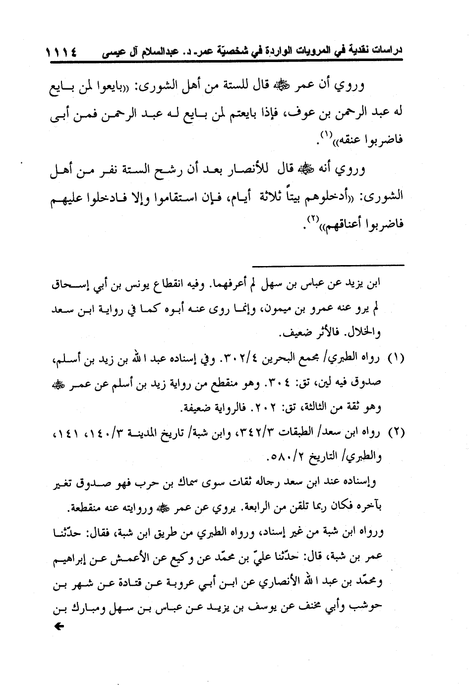 1 رواه الطبري/ مجمع البحرين 4/302. وفي إسناده عبد الله بن زيد بن أسلم، صدوق فيه لين، تق: 304. وهو منقطع من رواية زيد بن أسلم عن عمر رضي الله عنه وهو ثقة من الثالثة، تق: 202. فالرواية ضعيفة.