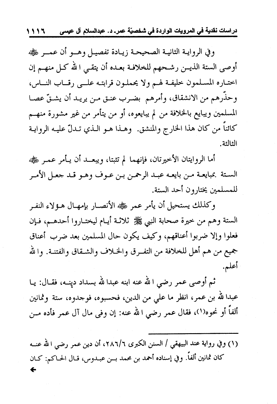 أما الروايتان الأخيرتان، فإنهما لم تثبتا، ويبعد أن يأمر عمر رضي الله عنه الستة بمبايعة من بايعه عبد الرحمن بن عوف وهو قد جعل الأمر للمسلمين يختارون أحد الستة.