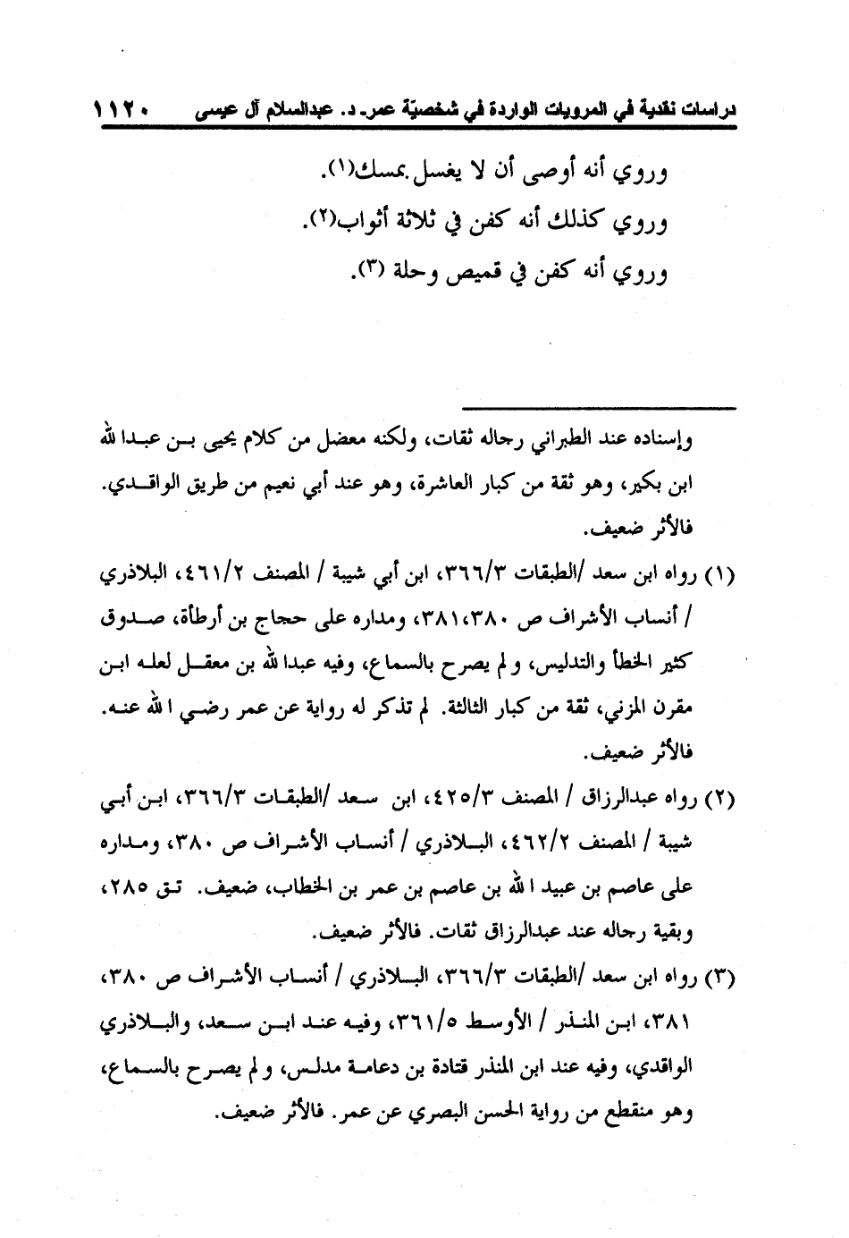 1 رواه ابن سعد /الطبقات 3/366، ابن أبي شيبة / المصنف 2/461، البلاذري / أنساب الأشراف ص 380،381، ومداره على حجاج بن أرطأة، صدوق كثير الخطأ والتدليس، ولم يصرح بالسماع، وفيه عبد الله بن معقل لعله ابن مقرن المزني، ثقة من كبار الثالثة. لم تذكر له رواية عن عمر رضي الله عنه. فالأثر ضعيف.
