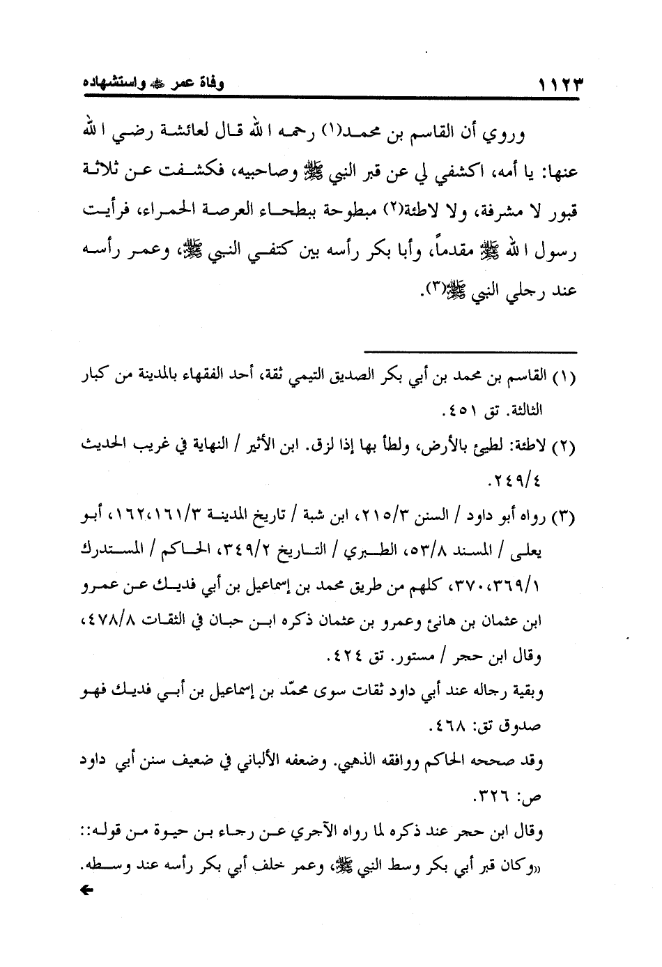 وروي أن القاسم بن محمد1 رحمه الله قال لعائشة رضي الله عنها: يا أمه، اكشفي لي عن قبر النبي صلى الله عليه وسلم وصاحبيه، فكشفت عن ثلاثة قبور لا مشرفة، ولا لاطئة2 مبطوحة ببطحاء العرصة الحمراء، فرأيت رسول الله صلى الله عليه وسلم مقدماً، وأبا بكر رأسه بين كتفي النبي صلى الله عليه وسلم، وعمر رأسه عند رجلي النبي صلى الله عليه وسلم3.