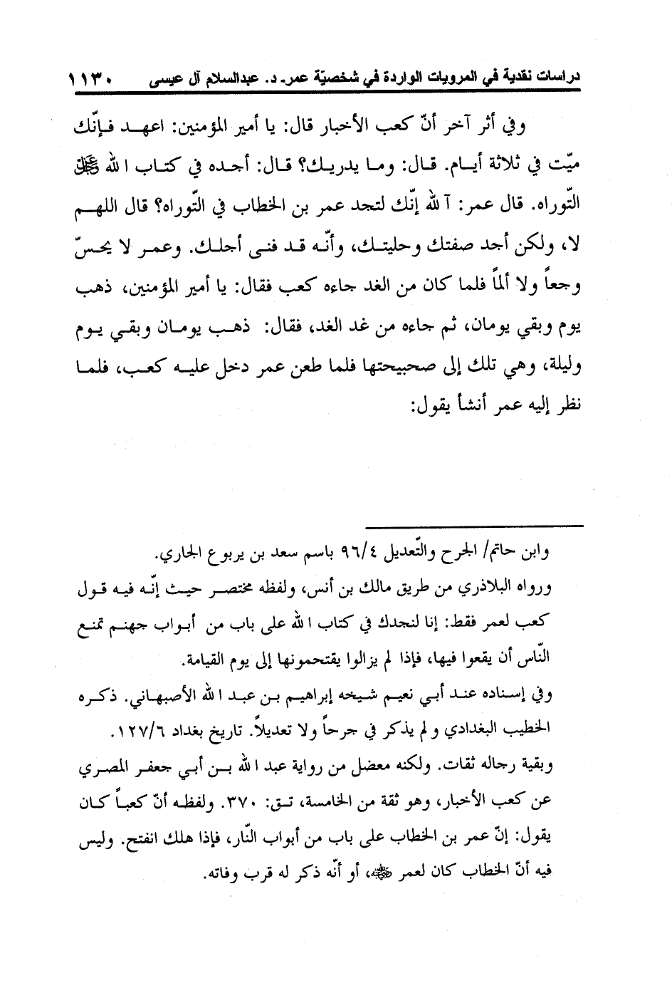 وبقية رجاله ثقات. ولكنه معضل من رواية عبد الله بن أبي جعفر المصري عن كعب الأخبار، وهو ثقة من الخامسة، تق: 370. ولفظه أنّ كعباً كان يقول: إنّ عمر بن الخطاب على باب من أبواب النّار، فإذا هلك انفتح. وليس فيه أنّ الخطاب كان لعمر رضي الله عنه، أو أنّه ذكر له قرب وفاته.