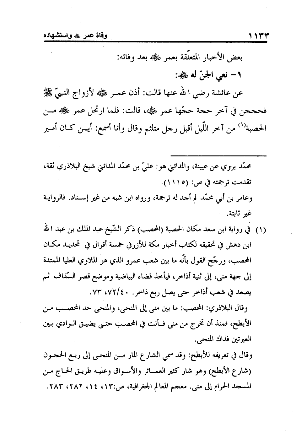 عن عائشة رضي الله عنها قالت: أذن عمر رضي الله عنه لأزواج النبيّ صلى الله عليه وسلم فحججن في آخر حجة حجّها عمر رضي الله عنه، قالت: فلما ارتحل عمر رضي الله عنه من الحصبة1 من آخر اللّيل أقبل رجل متلثم وقال وأنا أسمع: أين كان أمير