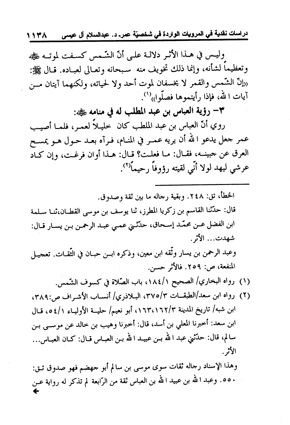 2 رواه ابن سعد/الطبقات 3/375، البلاذري/ أنساب الأشراف ص:389، ابن شبه/ تاريخ المدينة 3/162،163، أبو نعيم/ حلية الأولياء 1/54، قال ابن سعد: أخبرنا المعلي بن أسد، قال: أخبرنا وهيب بن خالد عن موسى بن سالم، قال: حدّثني عبد الله بن عبيد الله بن العباس قال: كان العباس ... الأثر.