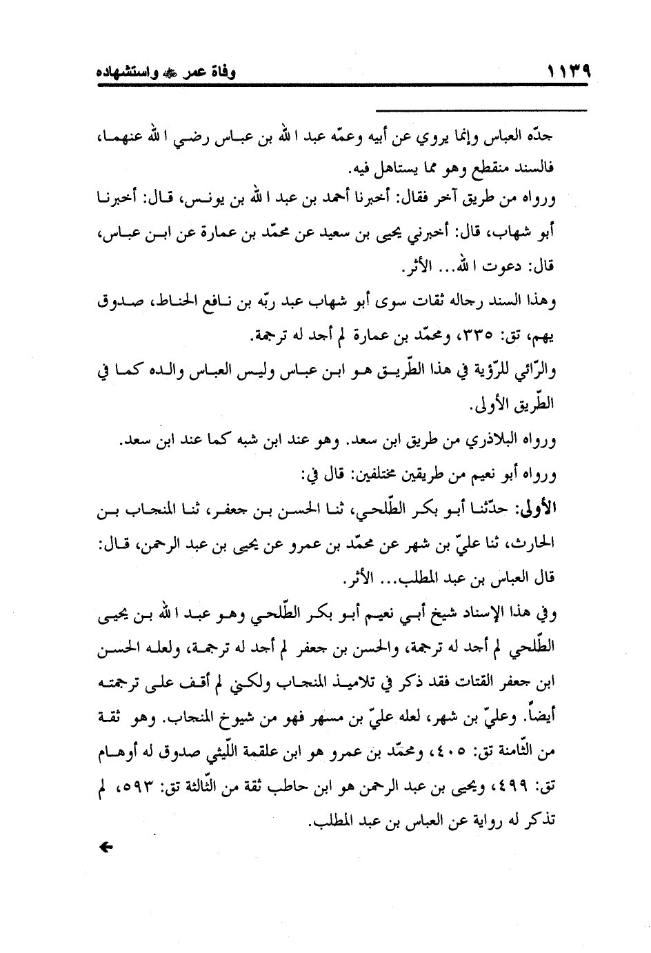 الأولى: حدّثنا أبو بكر الطّلحي، ثنا الحسن بن جعفر، ثنا المنجاب بن الحارث، ثنا عليّ بن شهر عن محمّد بن عمرو عن يحيى بن عبد الرحمن، قال: قال العباس بن عبد المطلب ... الأثر.