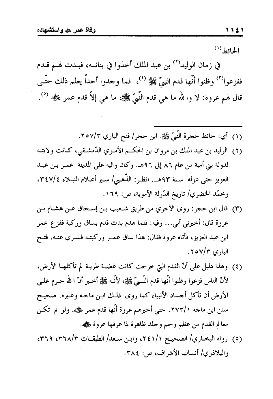 3 قال ابن حجر: روى الآجري من طريق شعيب بن إسحاق عن هشام بن عروة قال: أخبرني أبي ... وفيه: فلما هدم بدت قدم بساق وركبة ففزع عمر ابن عبد العزيز، فأتاه عروة فقال: هذا ساق عمر وركبته فسري عنه. فتح الباري 3/257.