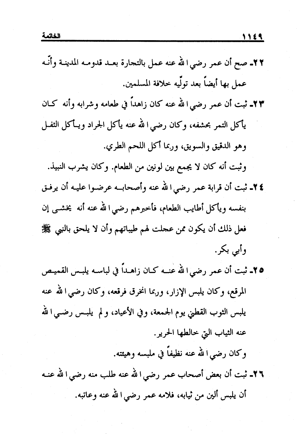 25- ثبت أن عمر رضي الله عنه كان زاهداً في لباسه يلبس القميص المرقع، وكان يلبس الإزار، وربما انخرق فرقعه، وكان رضي الله عنه يلبس الثوب القطني يوم الجمعة، وفي الأعياد، ولم يلبس رضي الله عنه الثياب التي خالطها الحرير.