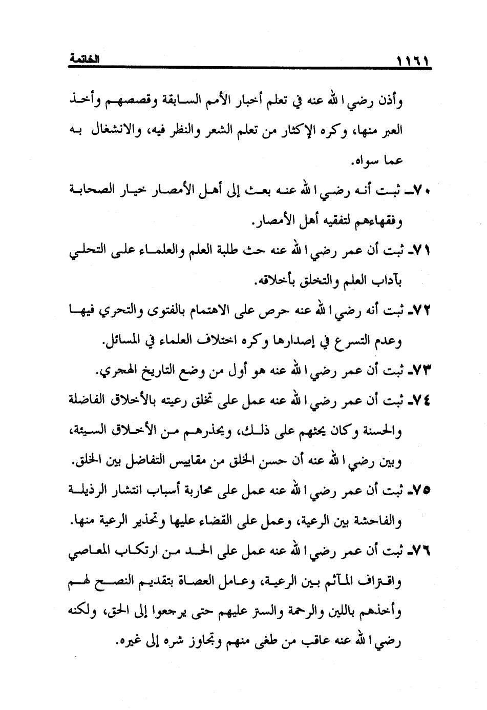 70- ثبت أنه رضي الله عنه بعث إلى أهل الأمصار خيار الصحابة وفقهاءهم لتفقيه أهل الأمصار.