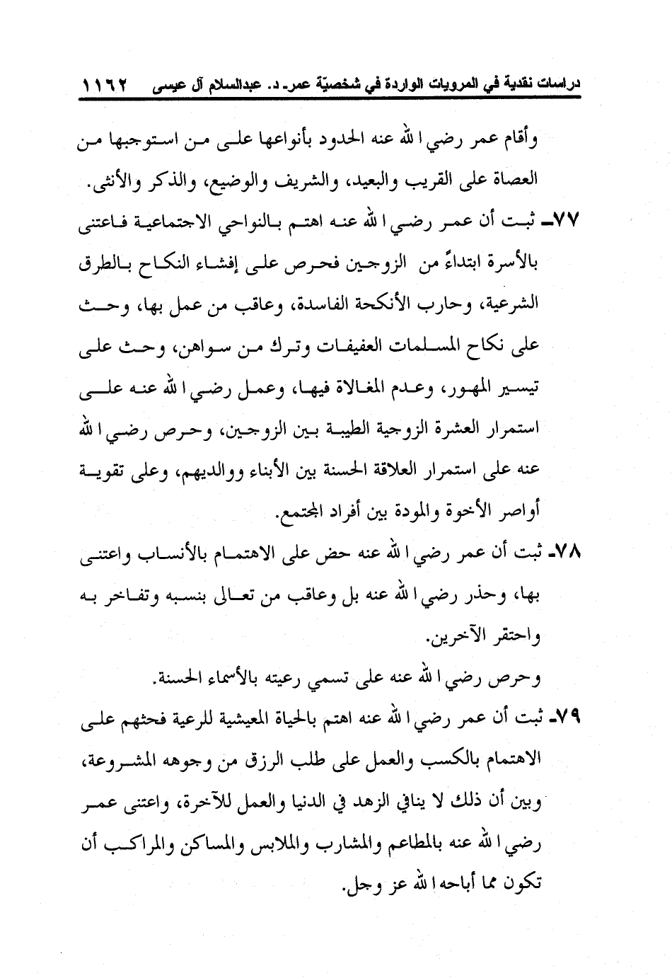 77- ثبت أن عمر رضي الله عنه اهتم بالنواحي الاجتماعية فاعتنى بالأسرة ابتداءً من الزوجين فحرص على إفشاء النكاح بالطرق الشرعية، وحارب الأنكحة الفاسدة، وعاقب من عمل بها، وحث على نكاح المسلمات العفيفات وترك من سواهن، وحث على تيسير المهور، وعدم المغالاة فيها، وعمل رضي الله عنه على استمرار العشرة الزوجية الطيبة بين الزوجين، وحرص رضي الله عنه على استمرار العلاقة الحسنة بين الأبناء ووالديهم، وعلى تقوية أواصر الأخوة والمودة بين أفراد المجتمع.