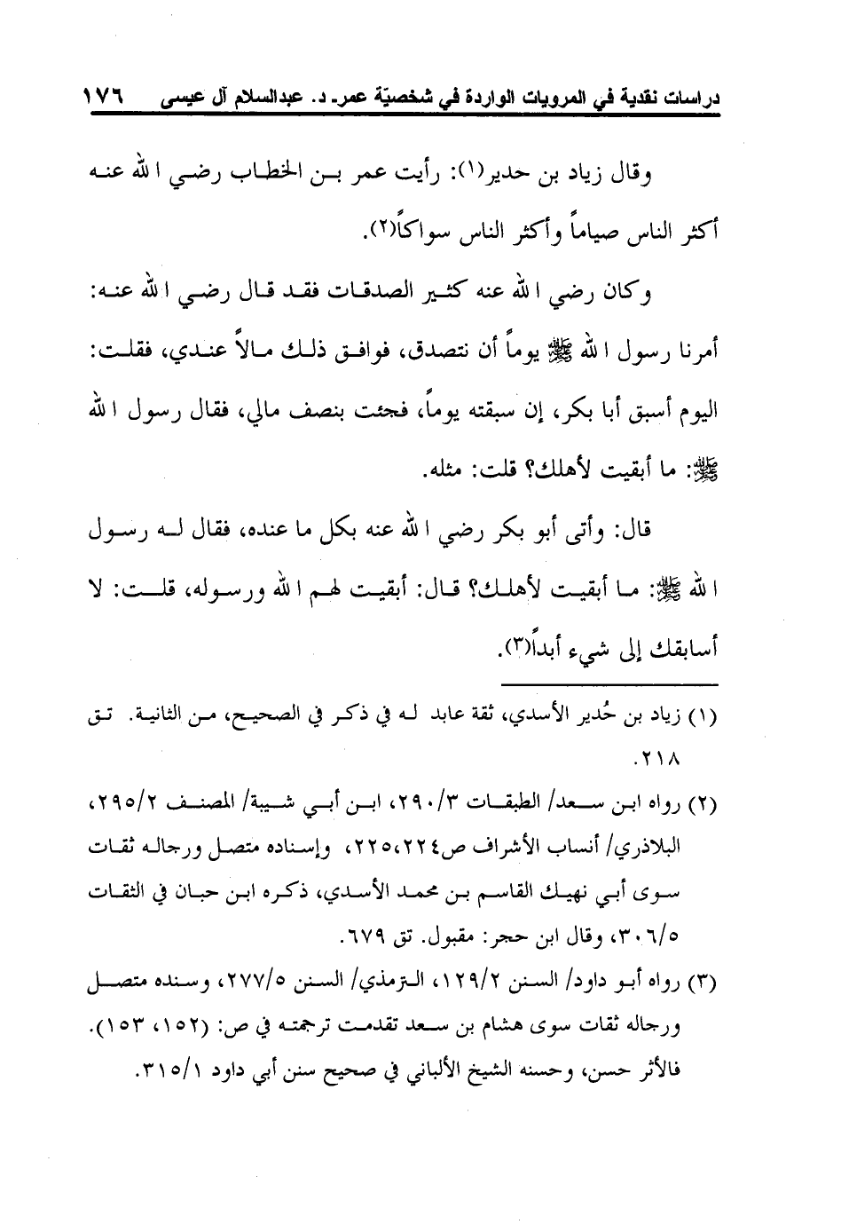 2 رواه ابن سعد/ الطبقات 3/290، ابن أبي شيبة/ المصنف 2/295، البلاذري/ أنساب الأشراف ص224،225، وإسناده متصل ورجاله ثقات سوى أبي نهيك القاسم بن محمد الأسدي، ذكره ابن حبان في الثقات 5/306، وقال ابن حجر: مقبول. تق 679.