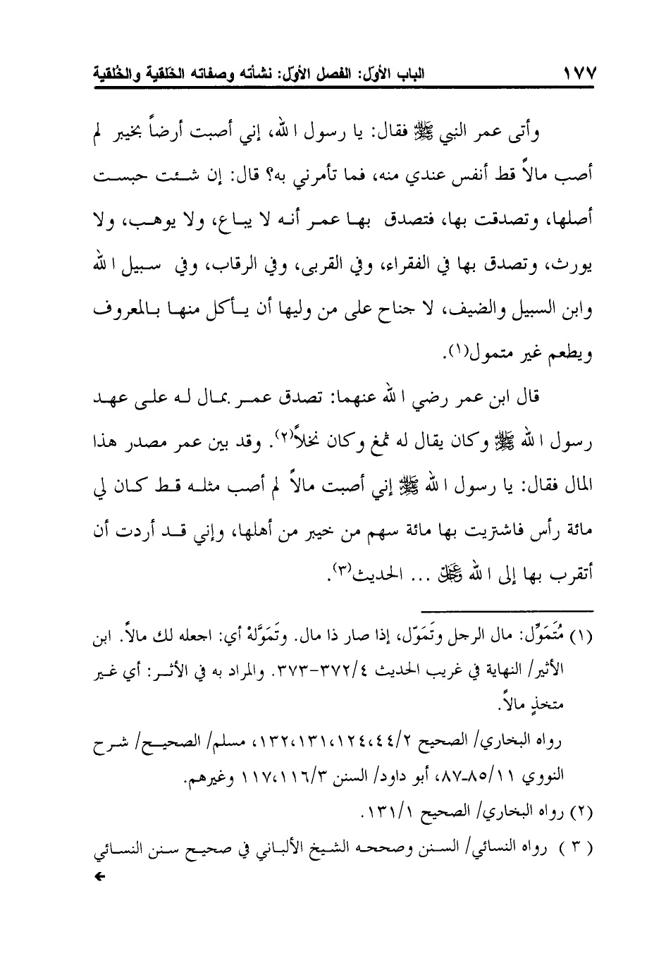 وأتى عمر النبي صلى الله عليه وسلم فقال: يا رسول الله، إني أصبت أرضاً بخيبر لم أصب مالاً قط أنفس عندي منه، فما تأمرني به؟ قال: "إن شئت حبست أصلها، وتصدقت بها "، فتصدق بها عمر أنه لا يباع، ولا يوهب، ولا يورث، وتصدق بها في الفقراء، وفي القربى، وفي الرقاب، وفي سبيل الله وابن السبيل والضيف، لا جناح على من وليها أن يأكل منها بالمعروف ويطعم غير متمول1.