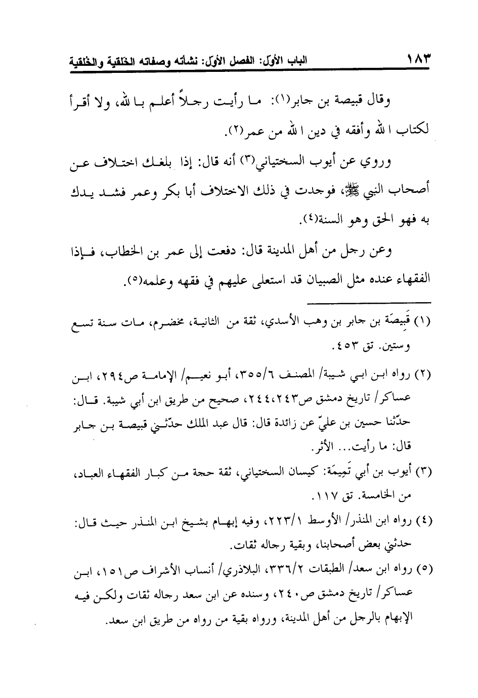 2 رواه ابن ابي شيبة/ المصنف 6/355، أبو نعيم/ الإمامة ص294، ابن عساكر/ تاريخ دمشق ص243،244، صحيح من طريق ابن أبي شيبة. قال: حدّثنا حسين بن عليّ عن زائدة قال: قال عبد الملك حدّثني قبيصة بن جابر قال: ما رأيت ... الأثر.