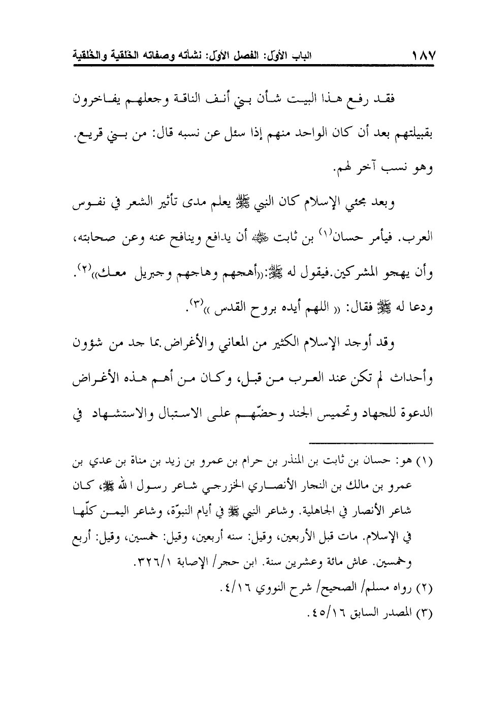 وبعد مجئي الإسلام كان النبي صلى الله عليه وسلم يعلم مدى تأثير الشعر في نفوس العرب. فيأمر حسان1 بن ثابت رضي الله عنه أن يدافع وينافح عنه وعن صحابته، وأن يهجو المشركين. فيقول له صلى الله عليه وسلم: "اهجهم وهاجهم وجبريل معك "2. ودعا له صلى الله عليه وسلم فقال: "اللهم أيده بروح القدس"3.