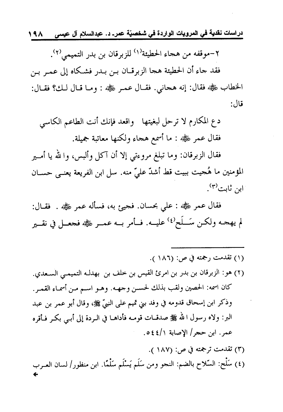 فقال الزبرقان: وما تبلغ مروءتي إلا أن آكل وألبس، والله يا أمير المؤمنين ما هُجيت ببيت قط أشدّ عليّ منه. سل ابن الفريعة يعنى حسان ابن ثابت3.