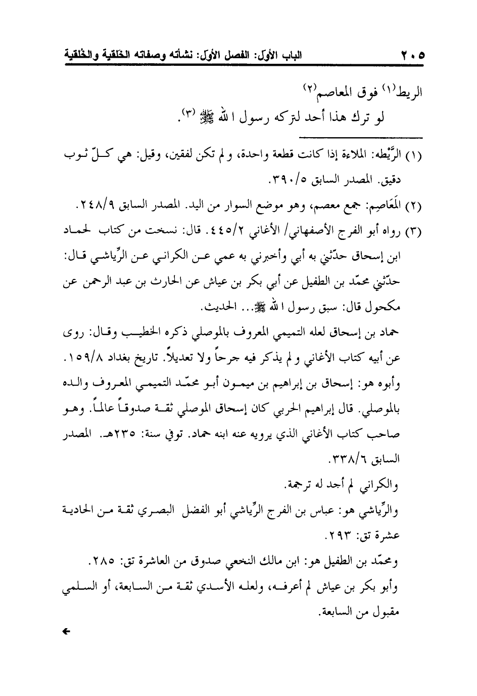 3 رواه أبو الفرج الأصفهاني/ الأغاني 2/445. قال: نسخت من كتاب لحماد ابن إسحاق حدّثني به أبي وأخبرني به عمي عن الكراني عن الرِّياشي قال: حدّثني محمّد بن الطفيل عن أبي بكر بن عياش عن الحارث بن عبد الرحمن عن مكحول قال: سبق رسول الله صلى الله عليه وسلم ... الحديث.