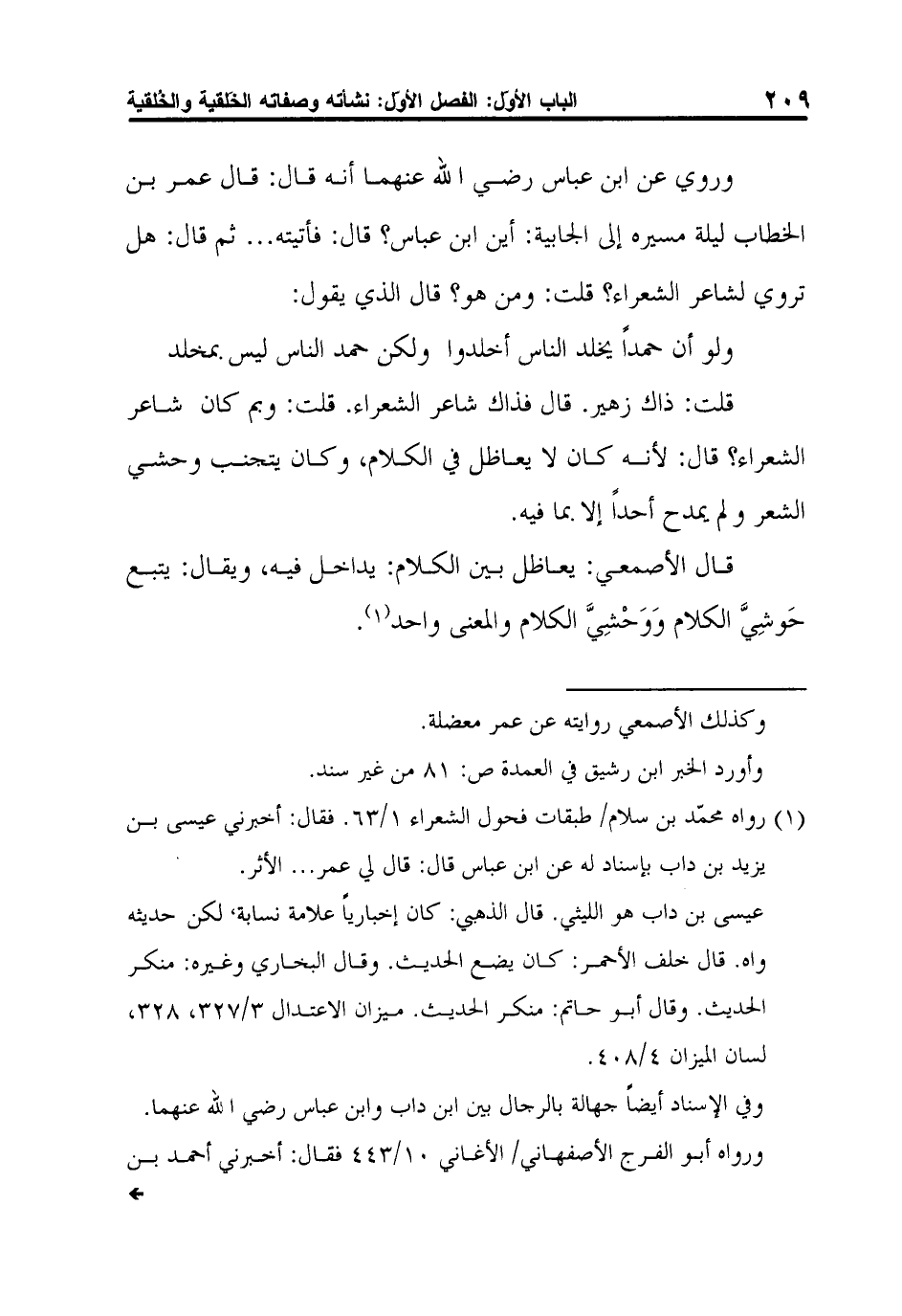 1 رواه محمّد بن سلام/ طبقات فحول الشعراء 1/63. فقال: أخبرني عيسى بن يزيد بن داب بإسناد له عن ابن عباس قال: قال لي عمر ... الأثر.