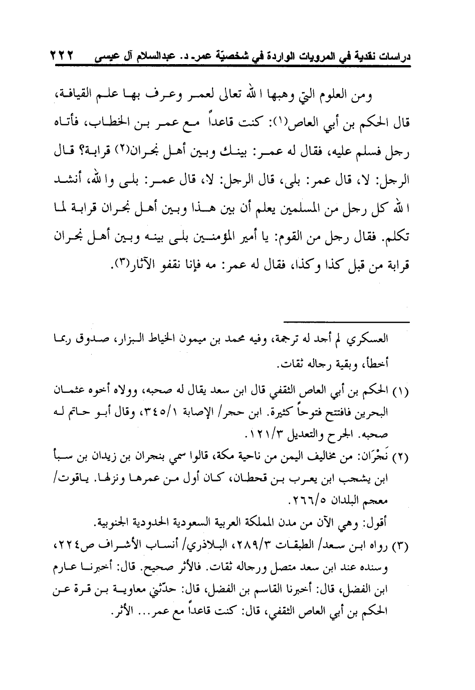 3 رواه ابن سعد/ الطبقات 3/289، البلاذري/ أنساب الأشراف ص224، وسنده عند ابن سعد متصل ورجاله ثقات. فالأثر صحيح. قال: أخبرنا عارم ابن الفضل، قال: أخبرنا القاسم بن الفضل، قال: حدّثني معاوية بن قرة عن الحكم بن أبي العاص الثقفي، قال: كنت قاعداً مع عمر ... الأثر.