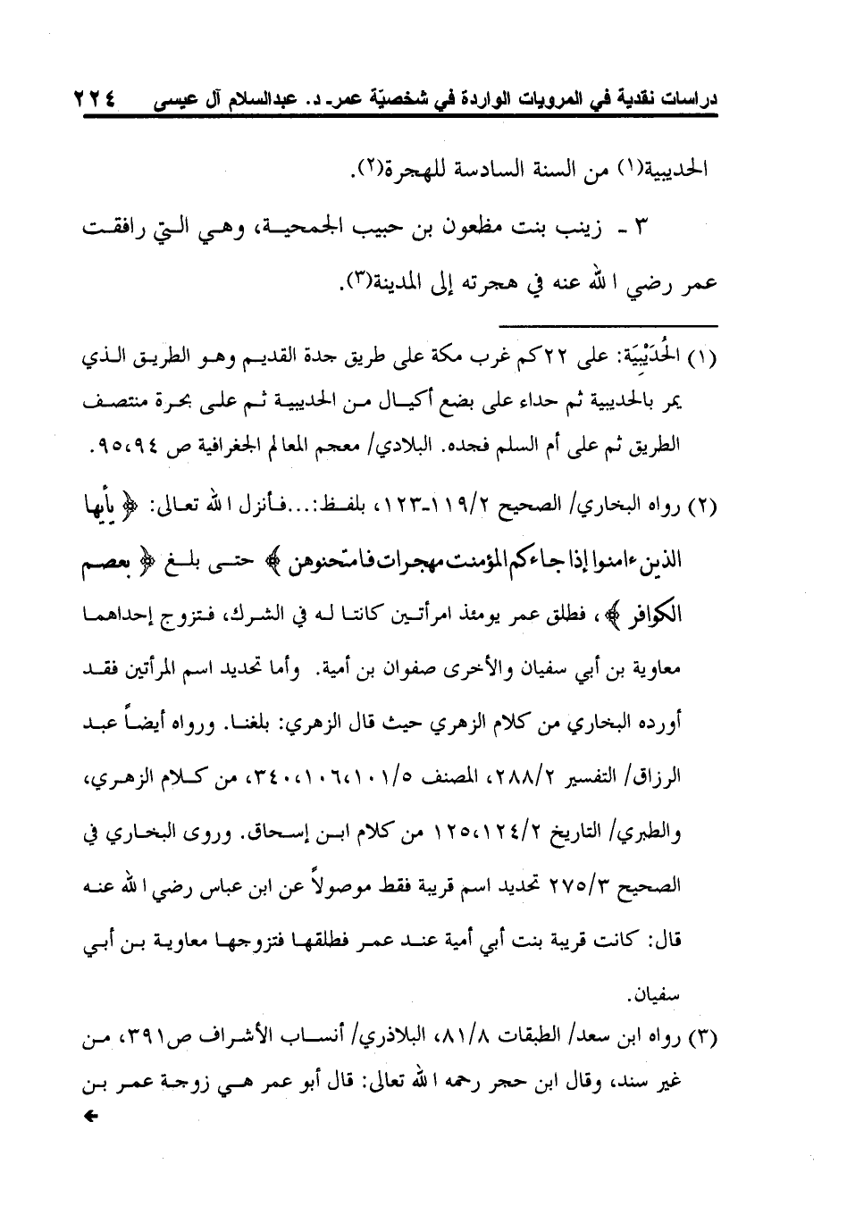 3 رواه ابن سعد/ الطبقات 8/81، البلاذري/ أنساب الأشراف ص391، من غير سند، وقال ابن حجر رحمه الله تعالى: قال أبو عمر هي زوجة عمر بن الخطاب ووالدة ولديه عبد الله وحفصة، ذكر الزبير أنها كانت من المهاجرات، وأخشى أن يكون وهماً لأنه قد قيل إنها ماتت بمكة قبل الهجرة، قلت: بل الوهم ممن قال ذلك، فقد ثبت عن عمر أنه قال في حق ولده عبد الله هاجر به أبواه، أخرجه البخاري من طريق نافع عن ابن عمر وذلك لما فضل أسامة بن زيد على عبد الله في القسم. الإصابة 4/319.