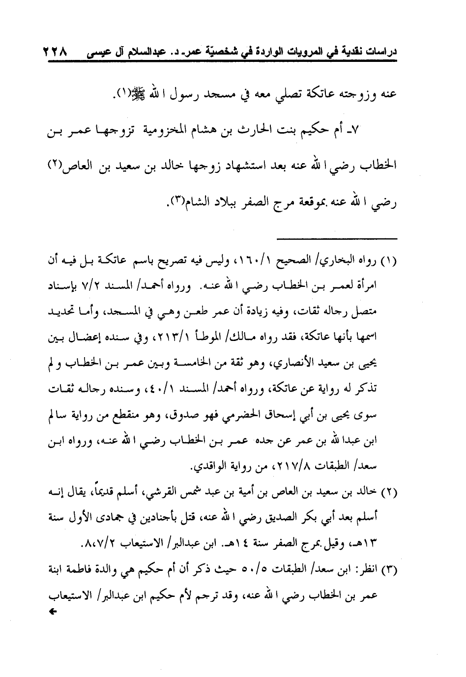 1 رواه البخاري/ الصحيح 1/160، وليس فيه تصريح باسم عاتكة بل فيه أن امرأة لعمر بن الخطاب رضي الله عنه. ورواه أحمد/ المسند 2/7 بإسناد متصل رجاله ثقات، وفيه زيادة أن عمر طعن وهي في المسجد، وأما تحديد اسمها بأنها عاتكة، فقد رواه مالك/ الموطأ 1/213، وفي سنده إعضال بين يحيى بن سعيد الأنصاري، وهو ثقة من الخامسة وبين عمر بن الخطاب ولم تذكر له رواية عن عاتكة، ورواه أحمد/ المسند 1/40، وسنده رجاله ثقات سوى يحيى بن أبي إسحاق الحضرمي فهو صدوق، وهو منقطع من رواية سالم ابن عبد الله بن عمر عن جده عمر بن الخطاب رضي الله عنه، ورواه ابن سعد/ الطبقات 8/217، من رواية الواقدي.