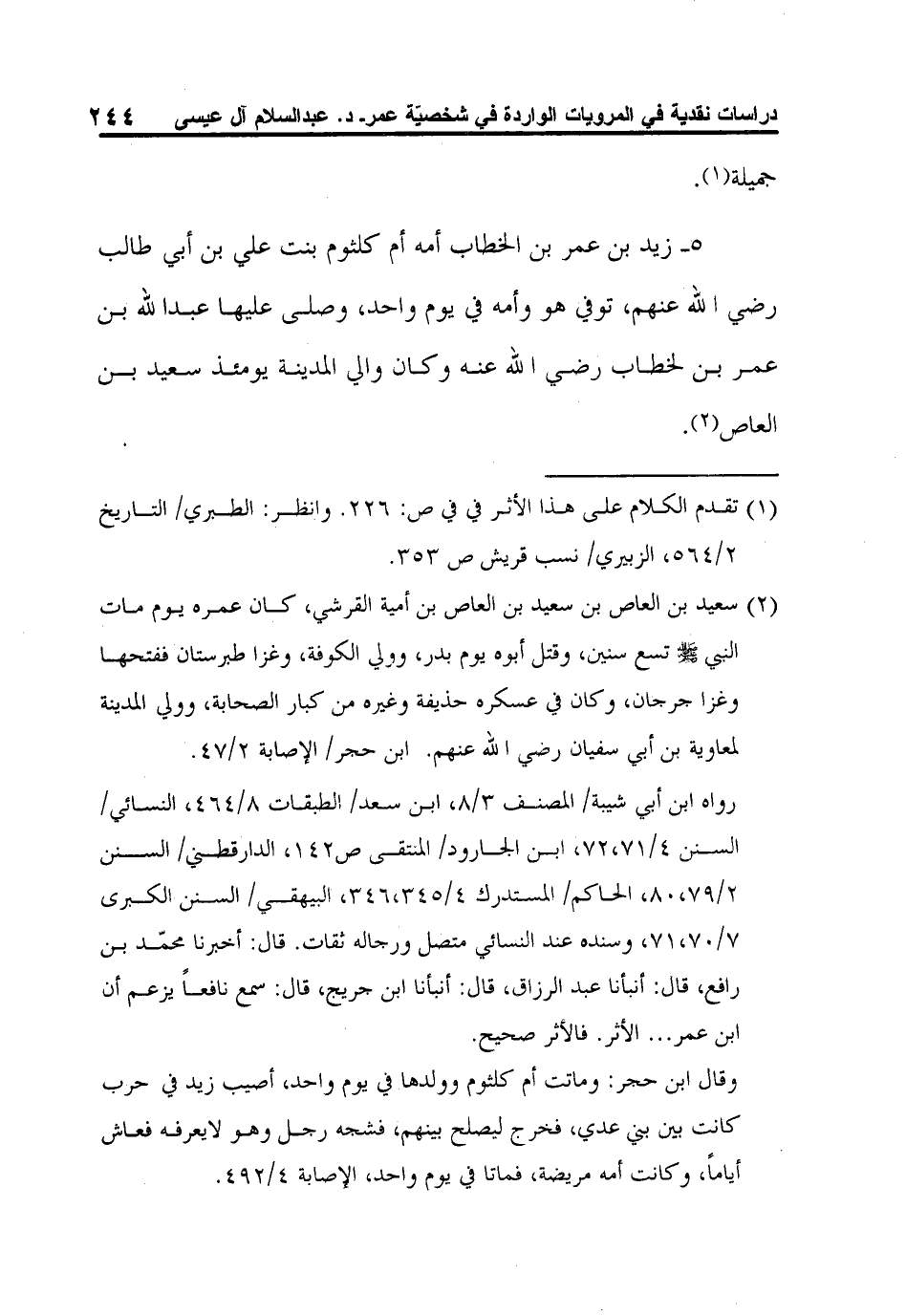 5- زيد بن عمر بن الخطاب أمه أم كلثوم بنت علي بن أبي طالب رضي الله عنهم، توفي هو وأمه في يوم واحد، وصلى عليها عبد الله بن عمر بن لخطاب رضي الله عنه وكان والي المدينة يومئذ سعيد بن العاص2.