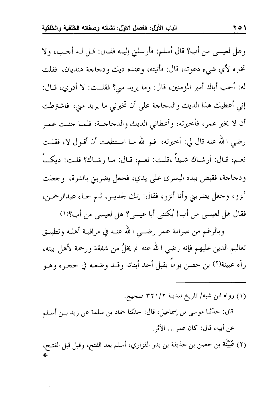 وهل لعيسى من أب؟ قال أسلم: فأرسلني إليه فقال: قل له أجب، ولا تخبره لأي شيء دعوته، قال: فأتيته، وعنده ديك ودجاجة هنديان، فقلت له: أجب أباك أمير المؤمنين، قال: وما يريد مني؟ فقلت: لا أدري، قال: إني أعطيك هذا الديك والدجاجة على أن تخبرني ما يريد مني، فاشترطت أن لا يخبر عمر، فأخبرته، وأعطاني الديك والدجاجة، فلما جئت عمر رضي الله عنه قال لي: أخبرته، فوالله ما استطعت أن أقول لا، فقلت نعم، قال: أرشاك شيئاً، قلت: نعم، قال: ما رشاك؟ قلت: ديكاً ودجاجة، فقبض بيده اليسرى على يدي، فجعل يضربني بالدرة، وجعلت أنزو، وجعل يضربني وأنا أنزو، فقال: إنك لجدير، ثم جاء عبد الرحمن، فقال هل لعيسى من أب! يُكتنى أبا عيسى؟ هل لعيسى من أب؟ 1