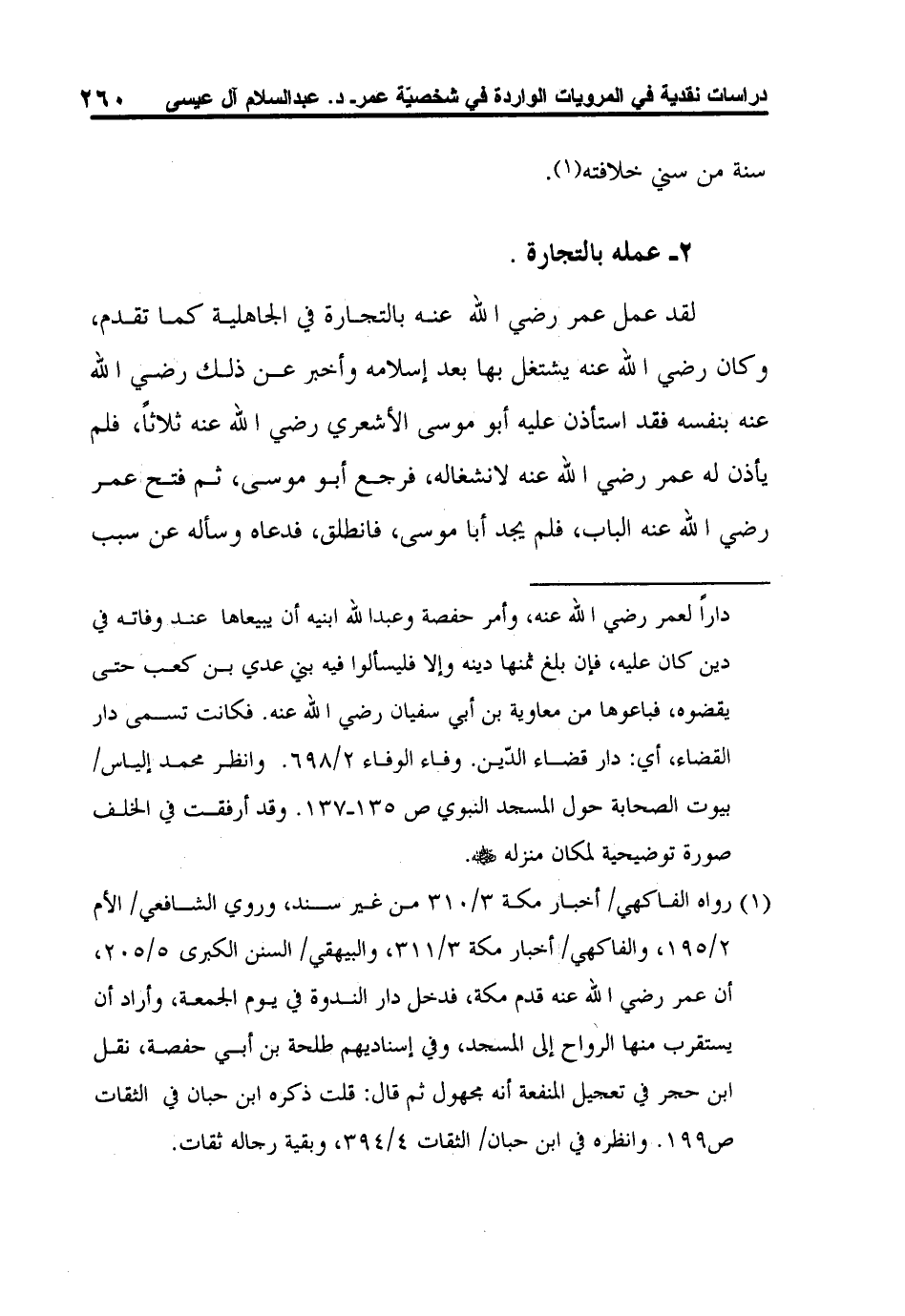 1 رواه الفاكهي/ أخبار مكة 3/310 من غير سند، وروي الشافعي/ الأم 2/195، والفاكهي/ أخبار مكة 3/311، والبيهقي/ السنن الكبرى 5/205، أن عمر رضي الله عنه قدم مكة، فدخل دار الندوة في يوم الجمعة، وأراد أن يستقرب منها الرواح إلى المسجد، وفي إسناديهم طلحة بن أبي حفصة، نقل ابن حجر في تعجيل المنفعة أنه مجهول ثم قال: قلت ذكره ابن حبان في الثقات ص199. وانظره في ابن حبان/ الثقات 4/394، وبقية رجاله ثقات.