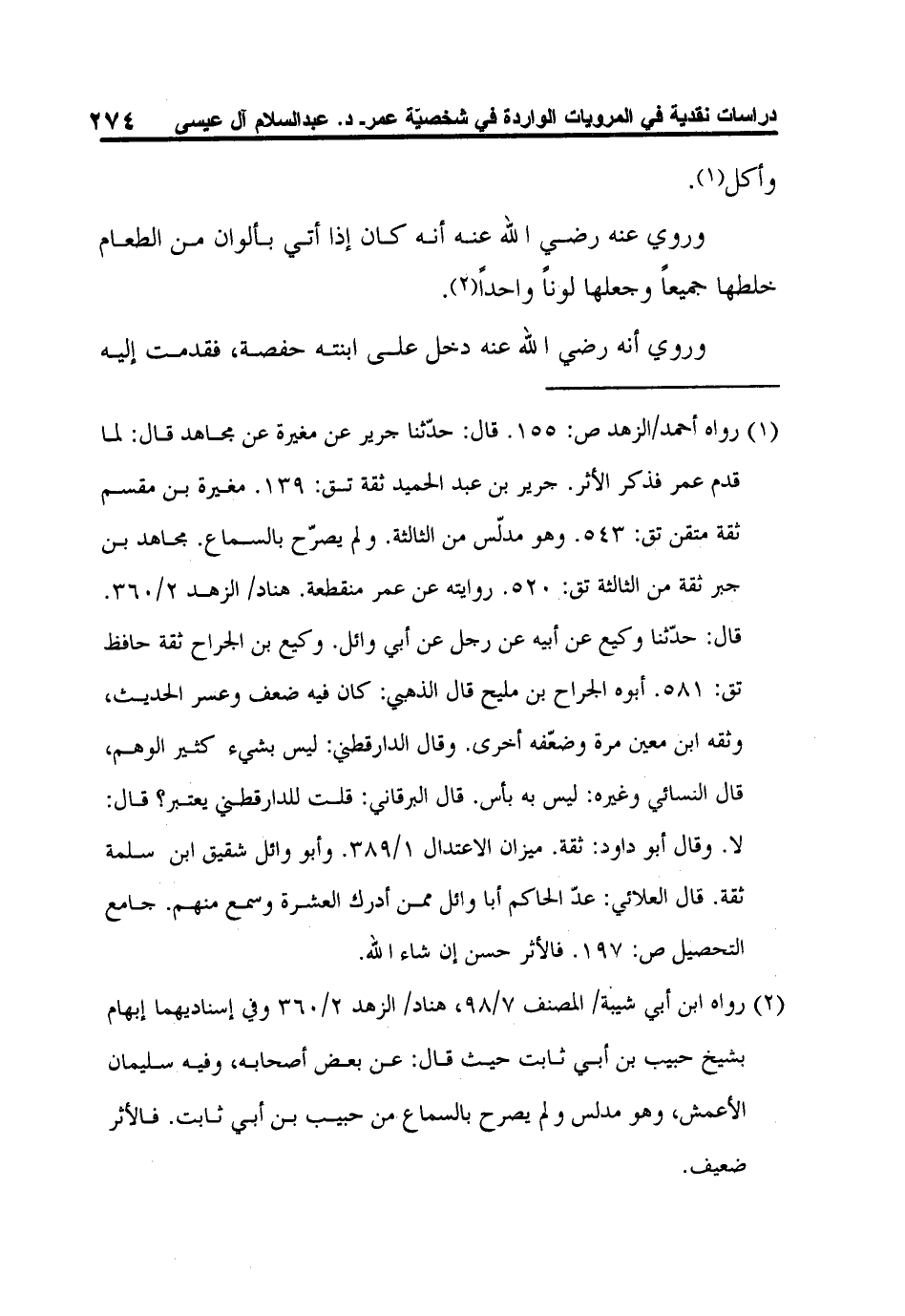 1 رواه أحمد/الزهد ص: 155. قال: حدّثنا جرير عن مغيرة عن مجاهد قال: لما قدم عمر فذكر الأثر. جرير بن عبد الحميد ثقة تق: 139. مغيرة بن مقسم ثقة متقن تق: 543. وهو مدلّس من الثالثة. ولم يصرّح بالسماع. مجاهد بن جبر ثقة من الثالثة تق: 520. روايته عن عمر منقطعة. هناد/ الزهد 2/360. قال: حدّثنا وكيع عن أبيه عن رجل عن أبي وائل. وكيع بن الجراح ثقة حافظ تق: 581. أبوه الجراح بن مليح قال الذهبي: كان فيه ضعف وعسر الحديث، وثقه ابن معين مرة وضعّفه أخرى. وقال الدارقطني: ليس بشيء كثير الوهم، قال النسائي وغيره: ليس به بأس. قال البرقاني: قلت للدارقطني يعتبر؟ قال: لا. وقال أبو داود: ثقة. ميزان الاعتدال 1/389. وأبو وائل شقيق ابن سلمة ثقة. قال العلائي: عدّ الحاكم أبا وائل ممن أدرك العشرة وسمع منهم. جامع التحصيل ص: 197. فالأثر حسن إن شاء الله.