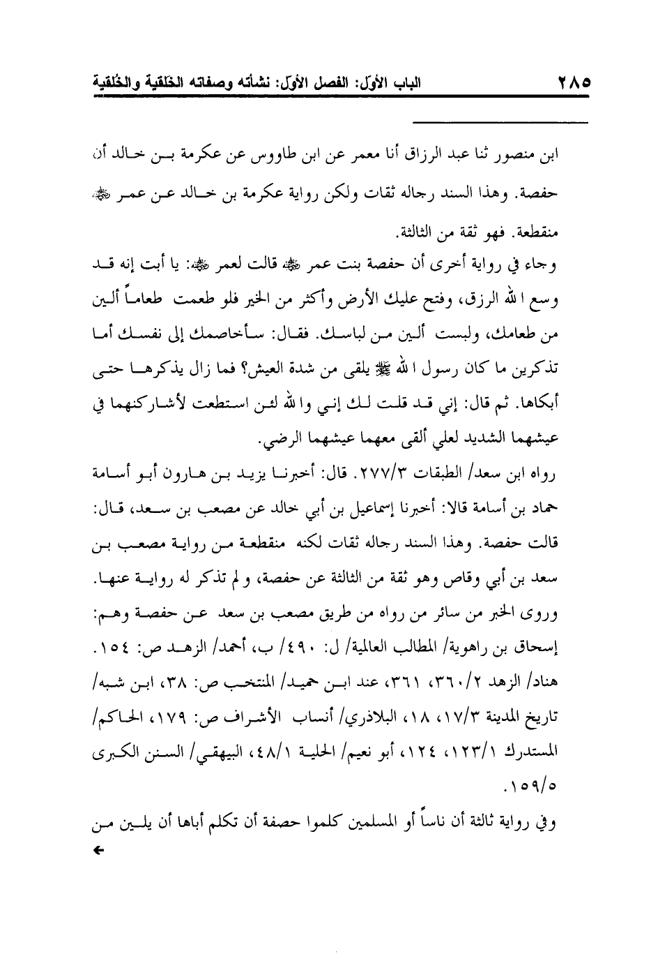رواه ابن سعد/ الطبقات 3/277. قال: أخبرنا يزيد بن هارون أبو أسامة حماد بن أسامة قالا: أخبرنا إسماعيل بن أبي خالد عن مصعب بن سعد، قال: قالت حفصة. وهذا السند رجاله ثقات لكنه منقطعة من رواية مصعب بن سعد بن أبي وقاص وهو ثقة من الثالثة عن حفصة، ولم تذكر له رواية عنها. وروى الخبر من سائر من رواه من طريق مصعب بن سعد عن حفصة وهم: إسحاق بن راهوية/ المطالب العالمية/ ل: 490/ ب، أحمد/ الزهد ص: 154. هناد/ الزهد 2/360، 361، عند ابن حميد/ المنتخب ص: 38، ابن شبه/ تاريخ المدينة 3/17، 18، البلاذري/ أنساب الأشراف ص: 179، الحاكم/ المستدرك 1/123، 124، أبو نعيم/ الحلية 1/48، البيهقي/ السنن الكبرى 5/159.